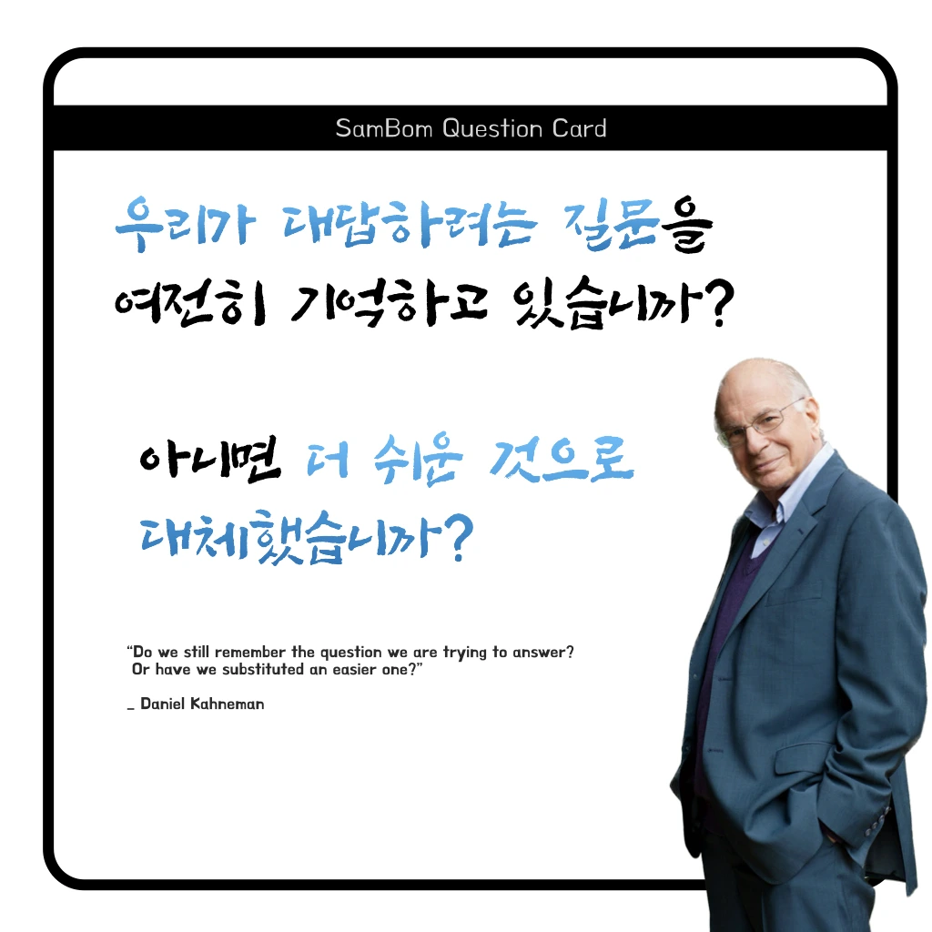 “Do we still remember the question we are trying to answer? Or have we substituted an easier one? 우리가 답하고자 하는 질문을 아직도 기억하고 있나요? 아니면 더 쉬운 질문으로 대체했나요?”_ Daniel Kahneman