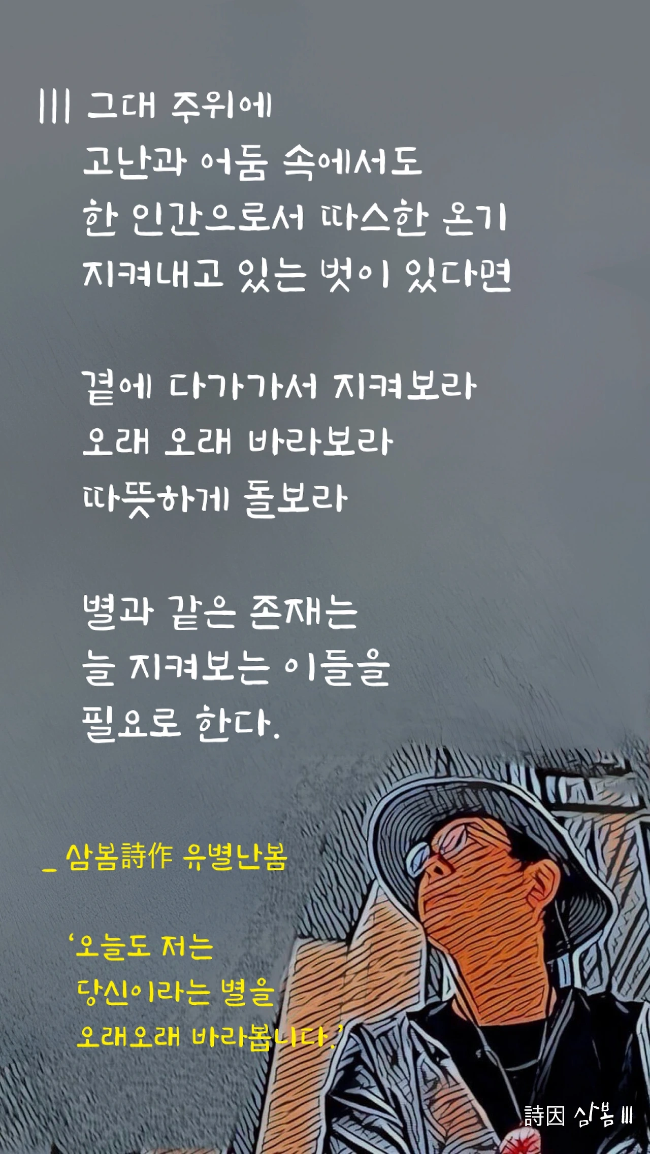 ||| 몇 년 전부터 삼봄씨라는 이름을 쓰기 시작하면서 결심한 게 있지. 앞으론 ㄴㅐ가 빛나는 삶을 살지 않기로 했어. 그냥 별난 벗의 친구로 살아가기로 했어. 아니면 벗이 별이 되는 일을 슬쩍 돕기도 하고. 다행히 삼봄씨는 벗들이 나눠주는 온기에 기대어 오늘도 살아가고 있어. 늘 고마워.