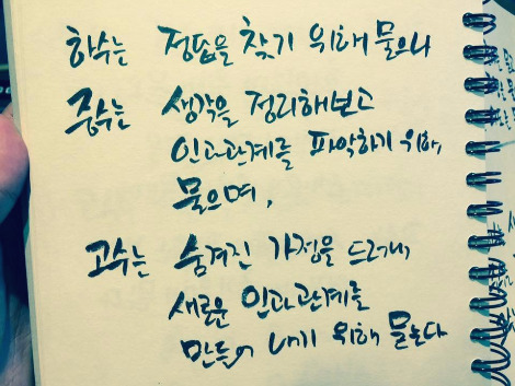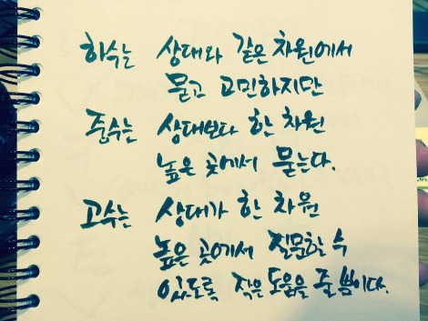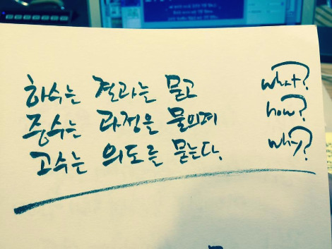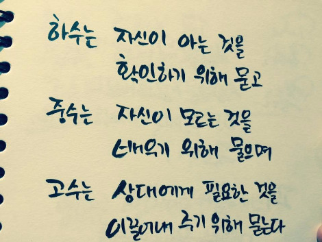 2) 아버님이 입원한 서울 모 병원에서 며칠 머물다보니 생각이 많아지더군요. 개인노트에 질문의 하수, 중수, 고수에 대한 단상 몇가지를 끄적여, 페이스북(링크)에 올렸습니다. 며칠 사이에 600명이 넘게 공유해주셨더군요. 사실 반응에 조금 놀랐습니다. 고수가 하수보다 더 우월하다는 뜻으로 끄적인 것은 아닙니다. 다만 내 질문이 상대와 만나거나, 세상과 만나고 있는지 돌아보자는 의미 정도로 받아들여주셨으면 합니다. 설명이 더 필요할 것 같아서, 글쓰기도 재개할겸 가볍게 메모들에 대한 설명을 주저리주저리 풀어봤습니다.