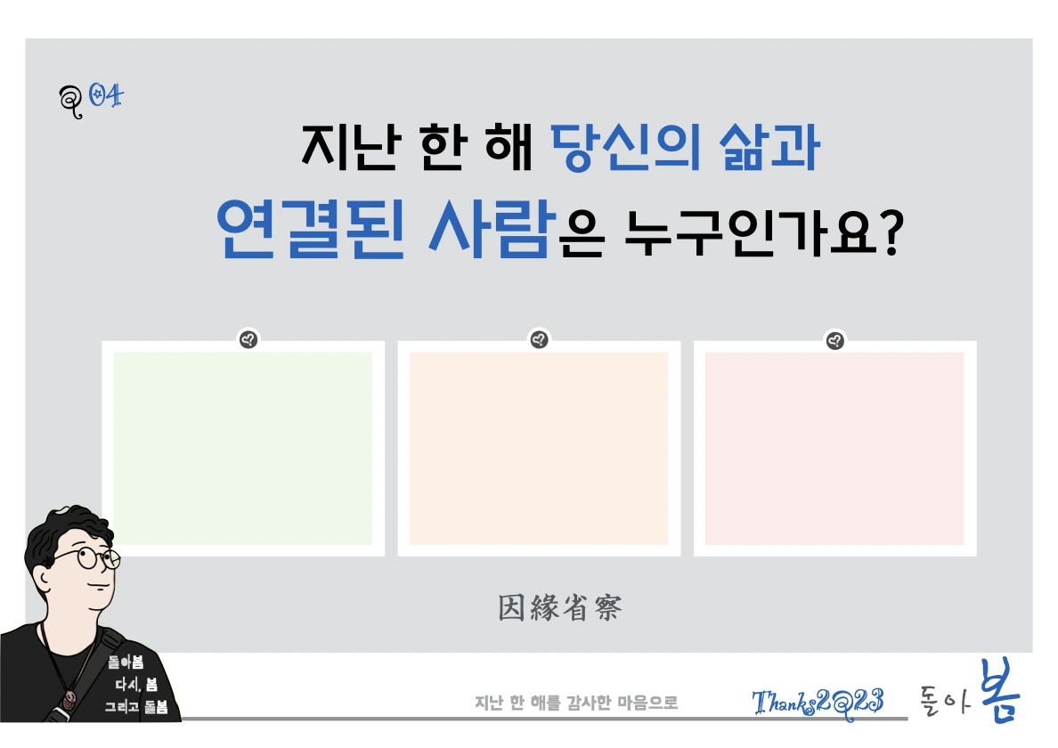 한 해를 돌아보는 성찰 모임을 진행할 때마다 빼먹지 않고 가장 먼저 하는 활동이 있다. 지난 한 해 동안 이룬 일을 정리하기에 앞서, 일 년이라는 시간 동안 당신의 삶에 연결된 사람들의 이름을 한 글자 한 글자 정성스럽게 써 보라고 권한다. 그리고 그 이름 밑에 그 사람을 떠올리면 감사한 것을 한 줄로라도 간단히 기록해 보시라고 권한다. 아리스토텔레스는 <니코마코스 윤리학>에서 ‘나를 더 나은 사람으로 만드는 존재가 친구다’라고 했다. 우리는 이런 벗들과의 만남을 통해 조금씩 온전한 인간으로 성숙해 나가게 된다.