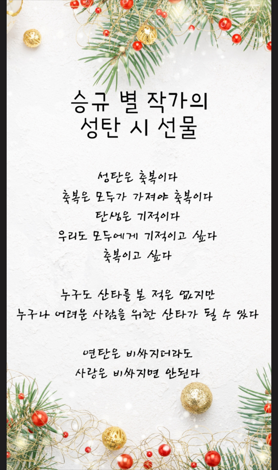 교회도 잘 나가지 않는 내게 크리스마스는 어떤 의미일까? 예수님의 가르침인 사랑을 다시금 떠올리며 단절을 극복하고, 연결을 회복할 수 있는 날이 될 수 있음을 깨닫는다. 성탄이 가까워지면 그동안 연결이 느슨해졌던 이들도 다시 연락하고 선물을 주고받으며 얼어붙은 사랑을 일깨우곤 한다.