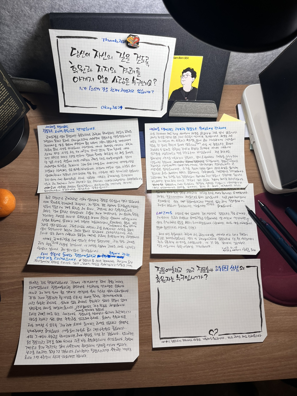 다시 한번 부탁드리지만 후원금은 개인당 최대 2만 4천 원이 넘지 않았으면 합니다. 그래도 마음을 전하기 부족하다고 느끼는 부자시라면 <윈키아 플래너>, 학토재 행복가게에서 판매하는 <다섯 손가락 질문카드> 혹은 저의 시집 <다시, 묻다>와 출간된 지 조금 오래되긴 했지만 <혁신가의 질문>이라는 책을 구매하여 지인들에게 나눠주시면 고맙겠습니다.