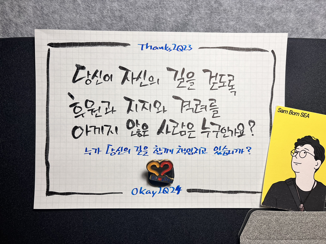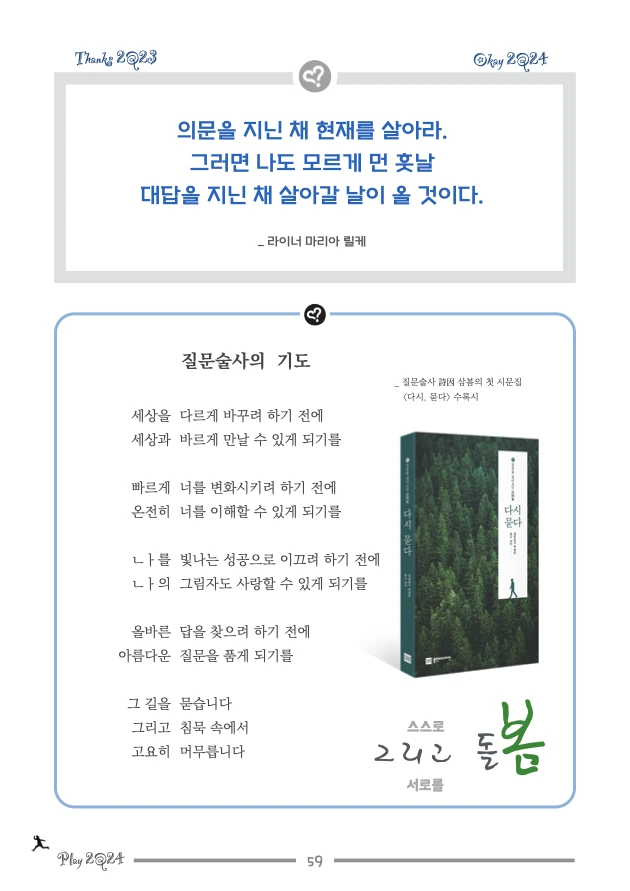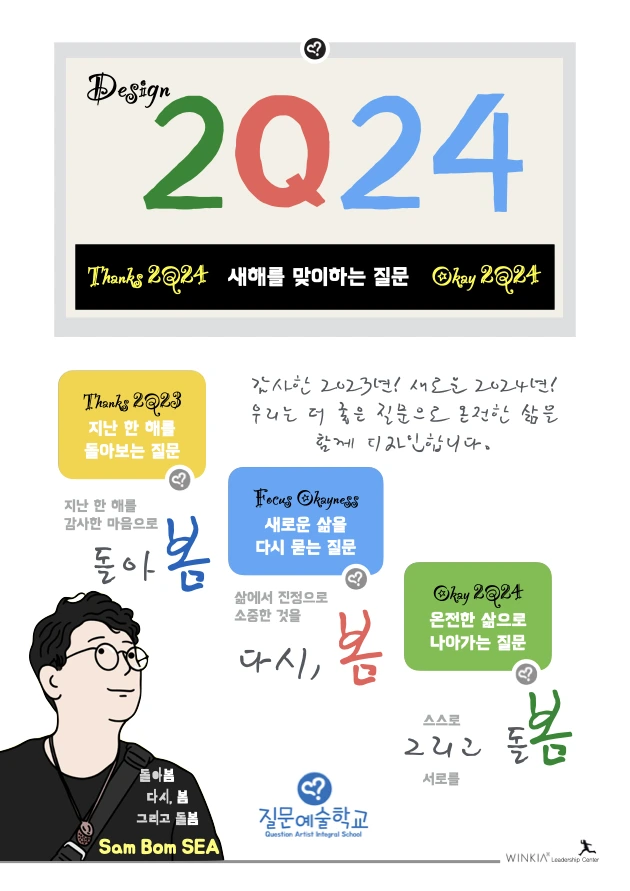 새해를 맞이하는 Design2Q24 공개워크숍을 올해도 열지 못했습니다. 질문노트라도 제작해서 공유해 달라는 벗들의 요청을 거절하지 못하고 올해도 ‘Design2Q24 새해맞이 질문노트’를 만들었습니다. 크리스마스를 앞둔 휴일에 사무실에 홀로 나와서 기존의 질문노트를 개선하며 잠들지 못한 긴 시간을 보냈습니다. 밥벌이도 아니고 회사일도 아닌데 보통 사람들은 가족과 함께 보낼 시간에 저는 왜 이렇게 연휴를 보내고 있는지 묻게 됩니다. 아마 지난 18년간 매년 연말 연초가 되면, 다들 멀리서 찾아와 하루 종일 한 해를 돌아보는 뜻깊은 성찰의 시간을 보낸 벗들에 대한 애정과 고마운 마음 때문이겠지요.