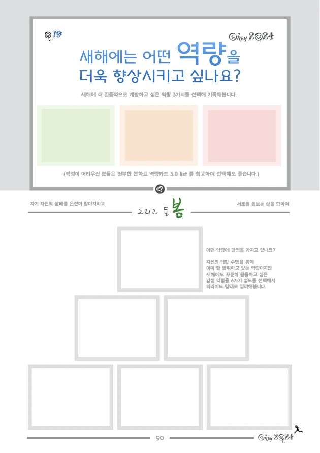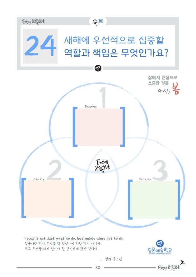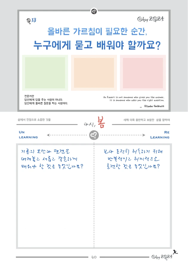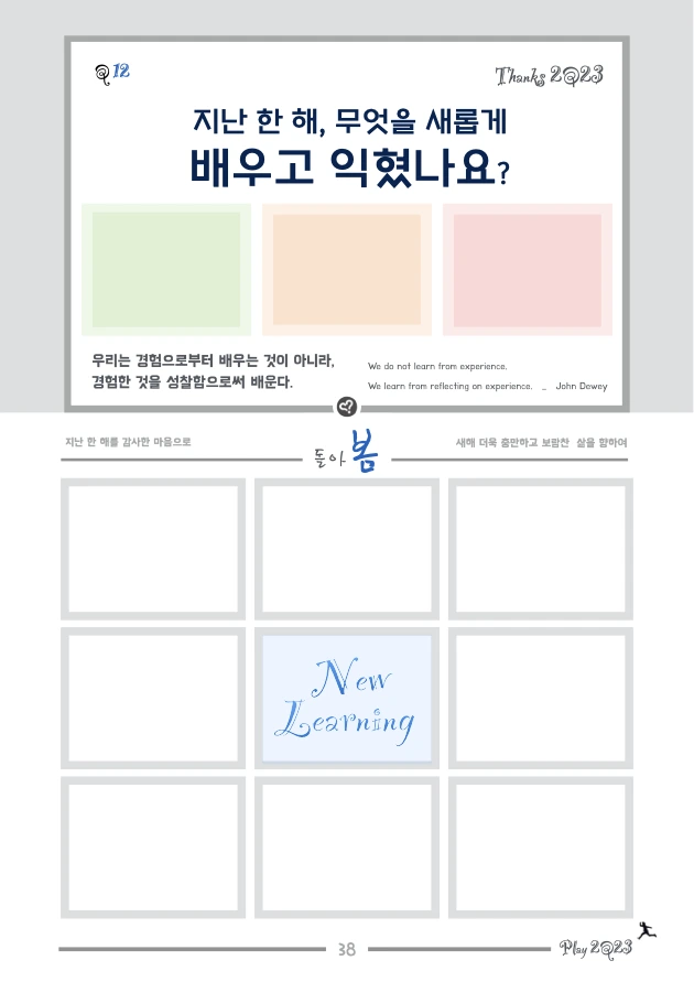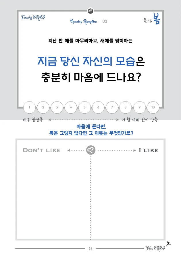 1. Design 2Q24 삼봄질문노트는 삼봄(박영준) 코치가 18년 이상 진행해 오며 쌓인 개인적 경험과 노하우를 바탕으로 삶을 돌아보고 한 해의 삶을 재설계하기 위해 다시 디자인되었습니다. 18년 전 처음 과정을 만들 때는 지니 디츨러의 ‘Best Year Yet’ 프로그램 (Book : '내 생애 최고의 해' / 아시아코치센터)과 데비 포드의 ‘The Best Year of Your Life’ (Book : '생애 최고의 해를 설계하라' / 황금가지)을 뼈대로 삼았고, 이후 매년 목표설정 및 성찰과 관련된 콘텐츠를 학습하고 적용하면서 수정/보완해 왔습니다.