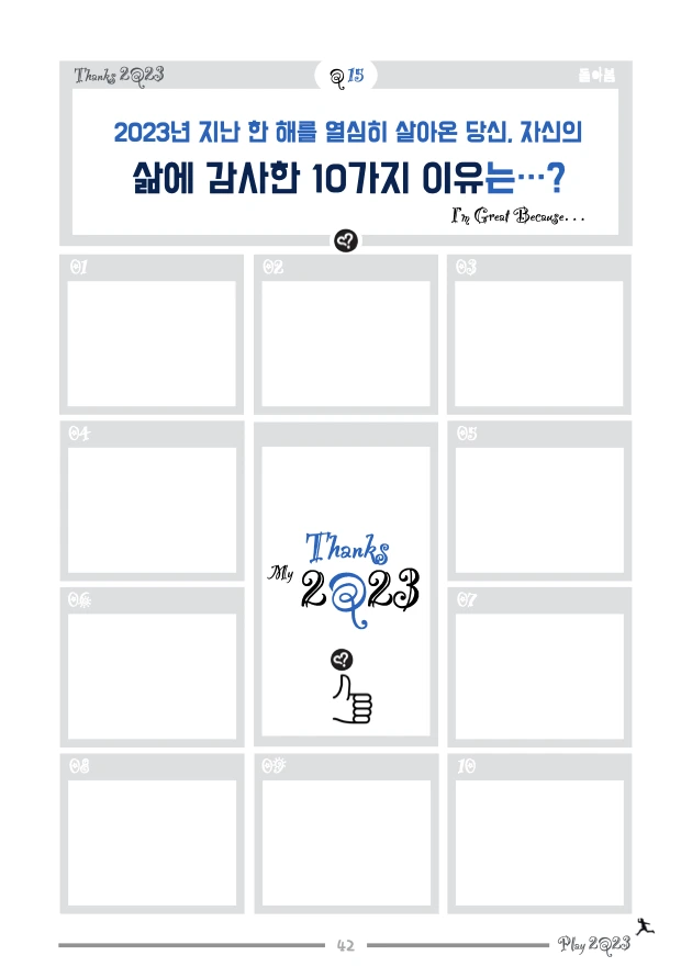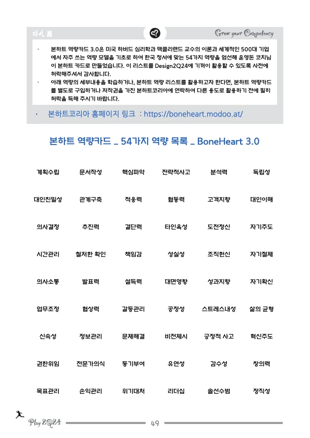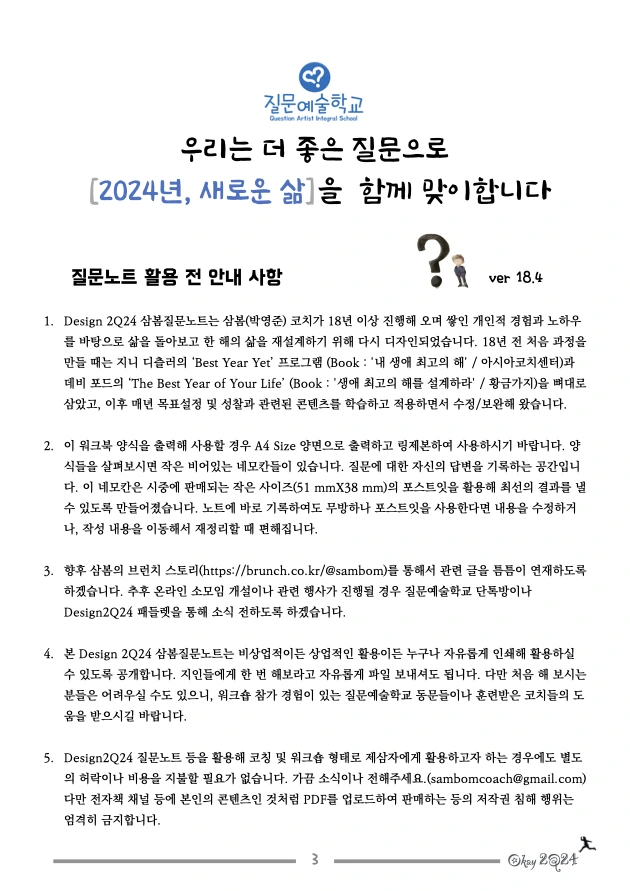 5. Design2Q24 질문노트 등을 활용해 코칭 및 워크숍 형태로 제삼자에게 활용하고자 하는 경우에도 별도의 허락이나 비용을 지불할 필요가 없습니다. 가끔 소식이나 전해주세요. (sambomcoach@gmail.com) 다만 전자책 채널 등에 본인의 콘텐츠인 것처럼 PDF를 업로드하여 판매하는 등의 저작권 침해 행위는 엄격히 금지합니다.