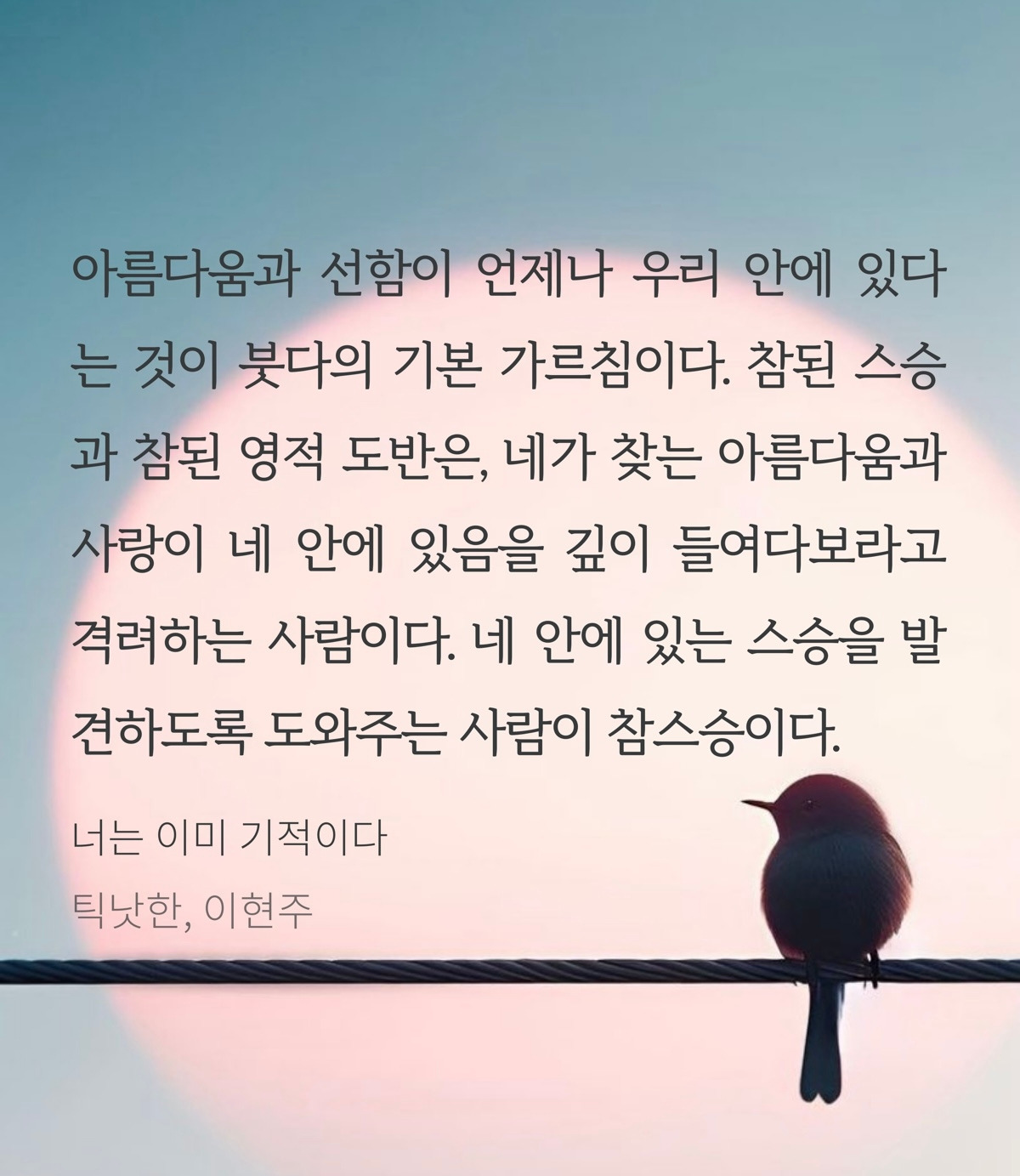 다행히 이번 삶에선 참으로 많은 스승을 만났습니다. 제가 끌렸던 스승들의 상당수는 “나처럼 해봐라. 이렇게”라는 말보다는 “너답게 살아라. 그렇게”라는 가르침을 주신 경우가 더 많았습니다.