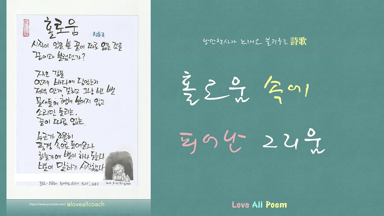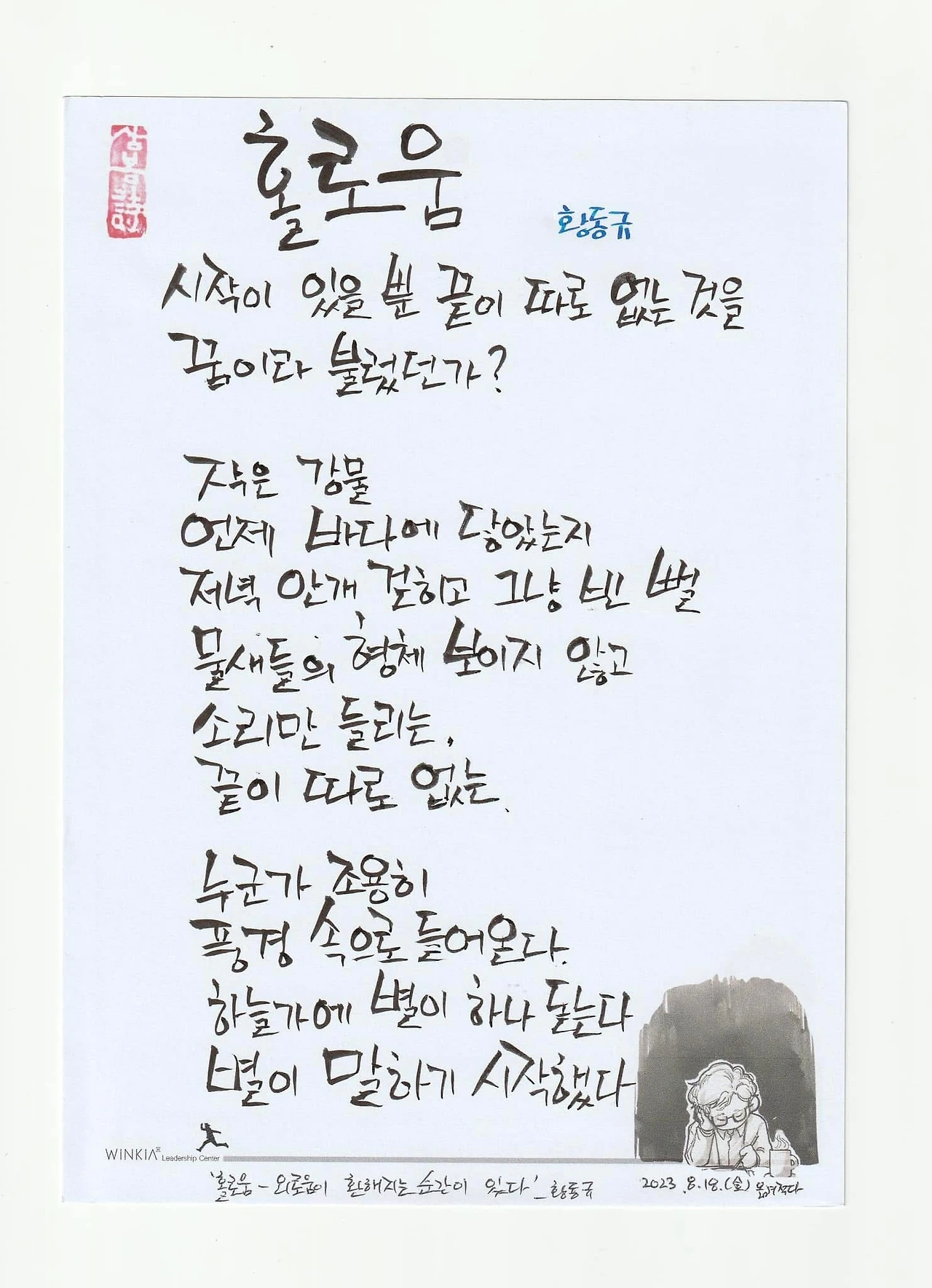 외로움을 즐겨야 하는 사람들, 홀로움을 경험하는 사람들, 비단 시인만 있겠습니까? 제가 그동안 만나본 수많은 창작자와 리더들도 자연스럽게 이 홀로움을 품고 경험하며 살아가는 이들입니다. 김윤배 시인은 서로의 홀로움을 오랫동안 마주 바라볼 수 있다면 그것이 우정이 된다고 말합니다. 외로움에 머물다가 - 그 외로움이 환해지는 순간 - 홀로움을 즐기는 저와 여러분을 응원하고 싶어 졌습니다. 홀로움에 머물다가 다시 만날 날을 기다려봅니다. 오늘도 홀로운 새벽에 시 한 편 읽고, 다시 새로운 하루를 시작해 봅니다.
