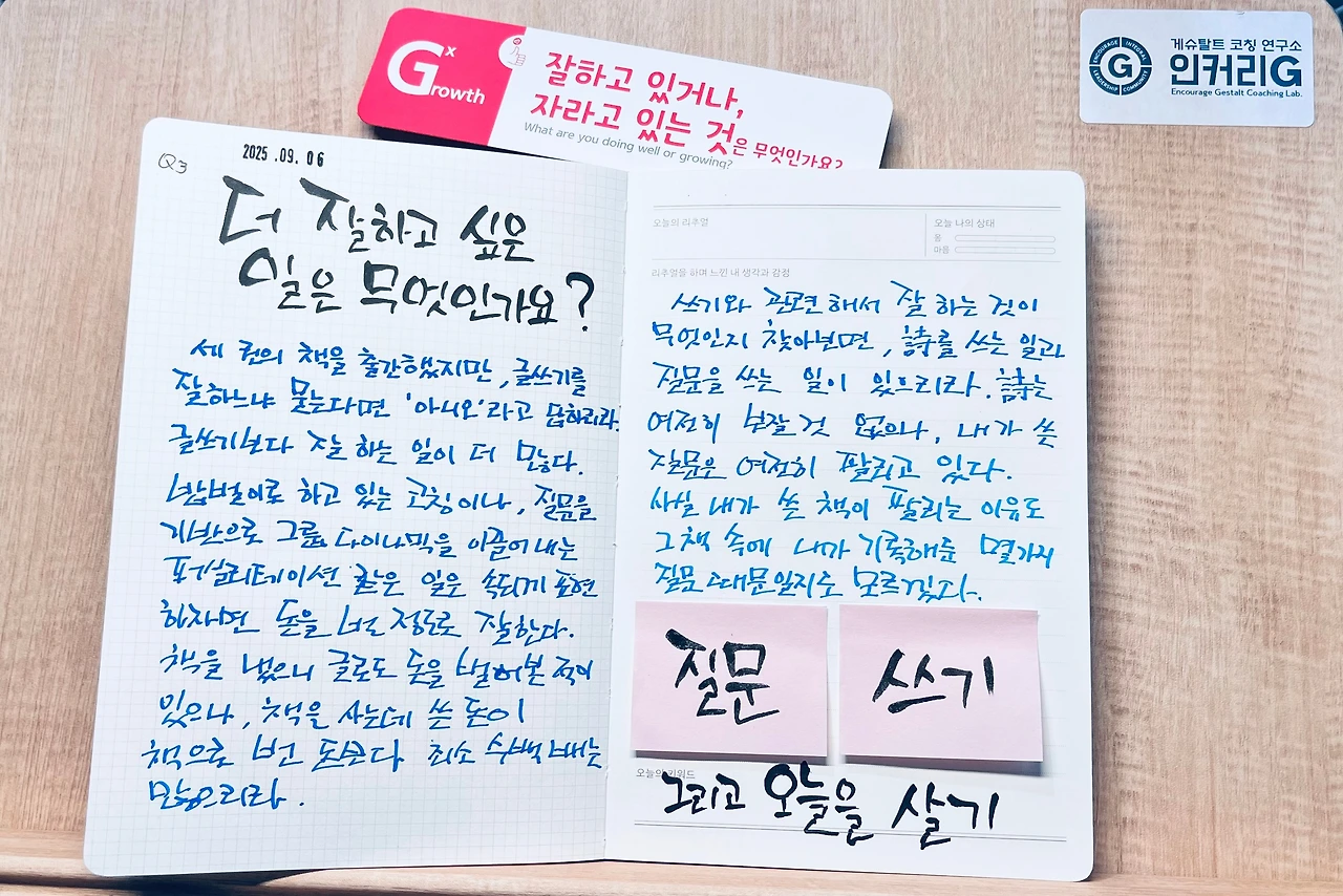 그렇다면 글쓰기보다 제가 더 잘하는 일은 무엇일까요? 다행히 여기에 대해서는 몇 가지 말씀드릴 수 있습니다. 저는 밥벌이로 코칭과 그룹 퍼실리테이션을 하고 있으며, 그 과정에서 질문을 적극적으로 활용합니다. 기획할 때도, 공부할 때도 질문을 바탕으로 사유를 전개하곤 합니다. 속되게 표현하자면, 저는 이 능력으로 생계를 유지할 만큼은 잘합니다. 흔히 어떤 능력으로 생업을 이어가면 “프로”라고 하지 않습니까. 그렇습니다. 자칫 자랑처럼 들릴까 조심스럽지만, 저는 질문의 프로입니다.