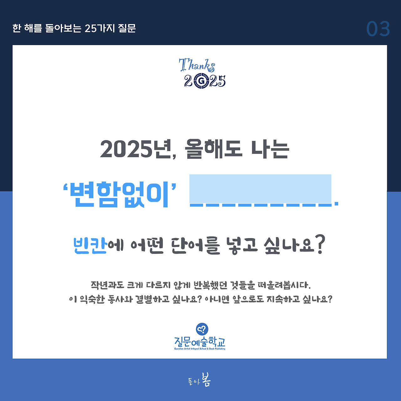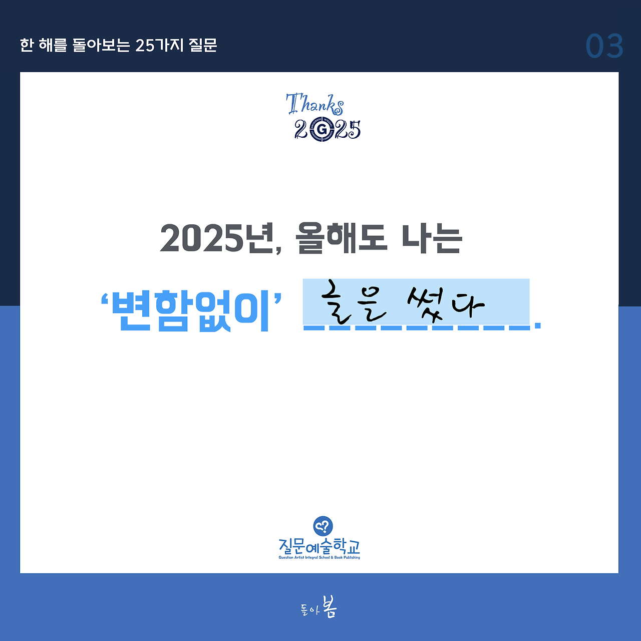 3일 차 질문의 키워드는 ‘변함없이’입니다. 올해도 변함없이 지속적으로 무언가를 하셨겠지요?