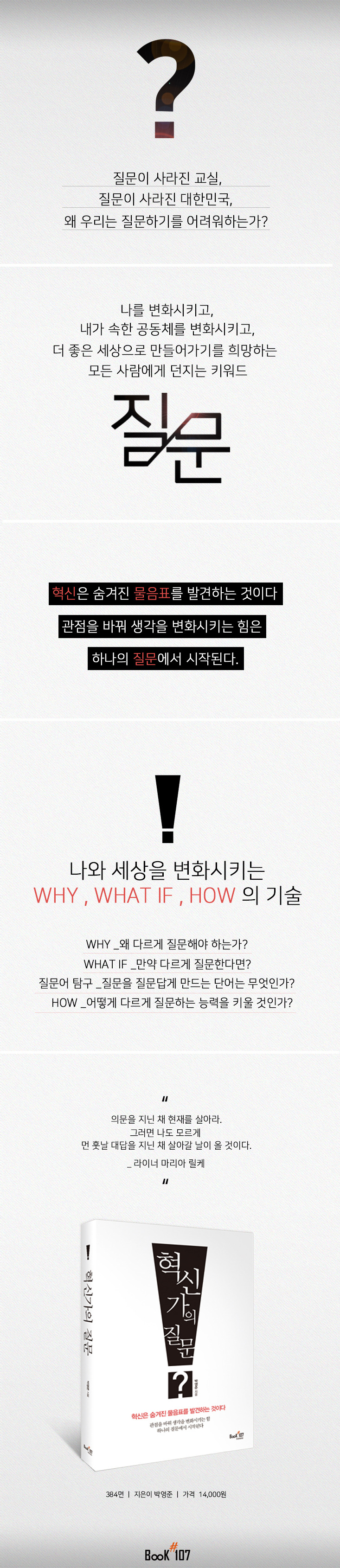 《혁신가의 질문》은 변화가 필요한 순간, 의미 있는 변화를 만들어갈 수 있는 수많은 질문이 담겨 있다. 이 책의 저자 질문디자인연구소 소장 박영준은 혁신은 마음속에 숨겨진 물음표를 찾아내는 것으로 시작된다고 말한다. ‘왜, 만약 ~한다면, 그리고 어떻게’라는 익숙한 질문에 답을 찾아가는 것이 아닌, 바로 그 궁금함을 표현하고 소통하는 방법으로 제시한다. 나를 변화시키고, 내가 속한 공동체를 변화시키고, 더 좋은 세상으로 만들어가기를 희망하는 모든 사람에게 다시 질문이라는 키워드를 던지고 있다.