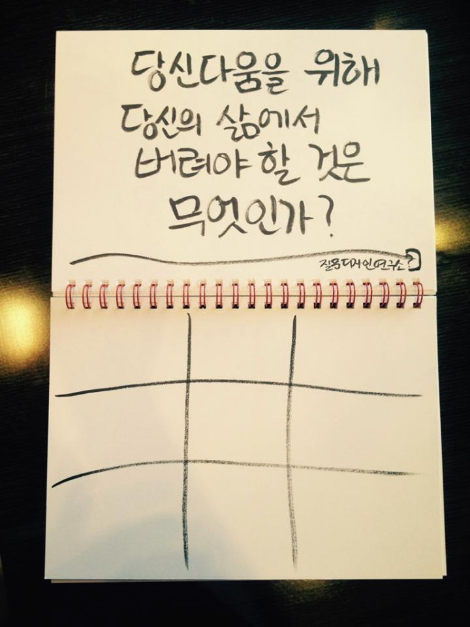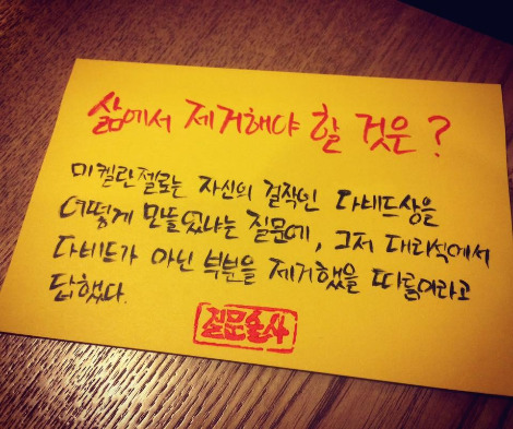 그 후 하나씩 지우고, 또 지우고, 또 지우는 일의 반복이었다. 하나씩 제거하는 과정에서 내 자아의 일부를 죽이는 느낌이 들기도 했다. 이 일을 하지 않아도 정말 좋아? 그러지 않아도 다른 사람과 조직에 충분한 도움이 될 수 있겠는지를 묻게 되었다. 망설이면서도 단 하나만 남겨두어야 한다는 심정으로 지우고 또 지웠다. 그리고 남은 단 하나의 단어가 '질문'이었다.