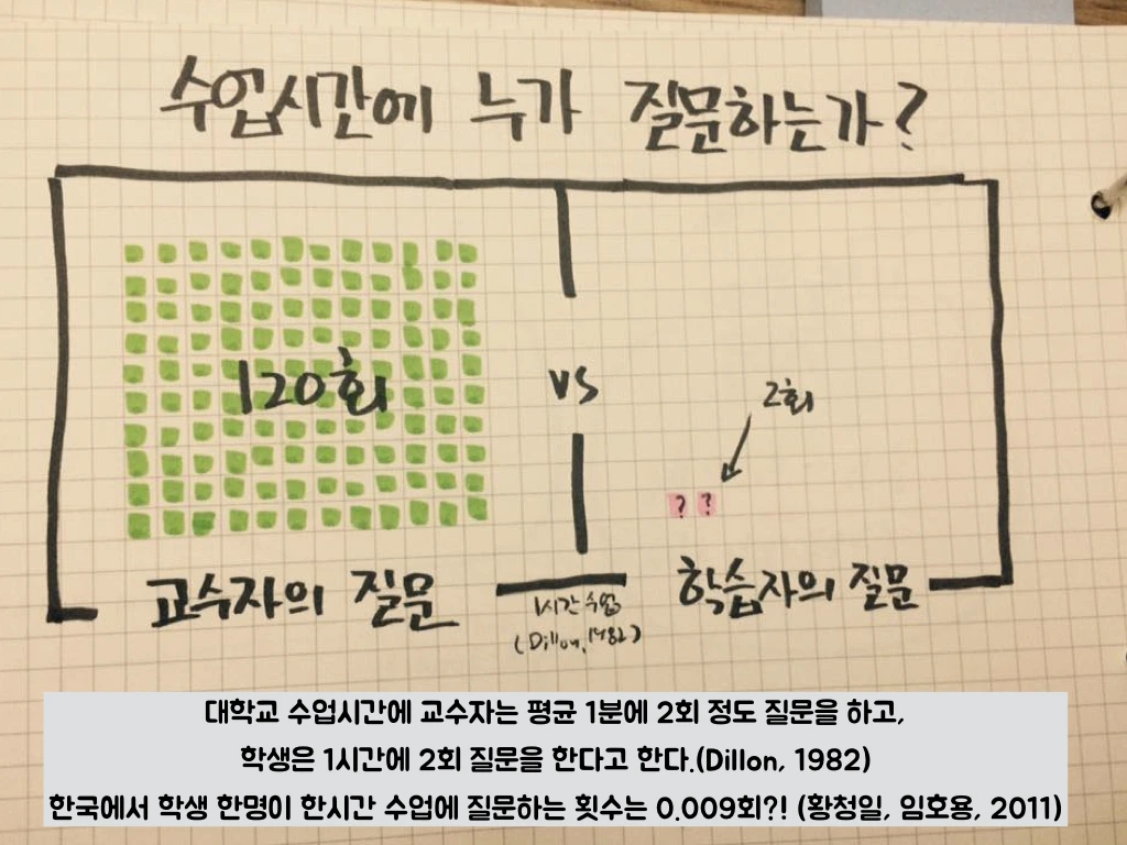 얼마전 대학 수업에서의 학습자와 교수자들의 질문 빈도를 조사한 황청일과 임호영의 연구를 흥미롭게 읽었다. Dillon의 연구(1982)에 따르면 미국의 대학에선 교수자가 1시간에 120회 질문하는 동안 학습자는 평균 2번 질문을 한다고 한다. 교수자는 학생들이 답하든, 답하지 않든 교육효과를 높이기 위해서 끊임없는 질문으로 학생들을 자극한다. 그런데 정작 배움을 얻어야 하는 학생들의 질문 빈도는 너무 적은게 아닐까?