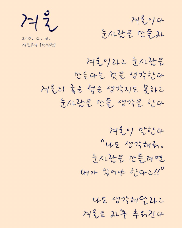 아직 초등학생인 둘째가 끄적인 시다. 이날은 언니의 고등학교 입학면접이 있었다. 날은 추었고, 길거리에 눈이 쌓여있었다. 면접을 보는 언니에게 엄마와 아빠의 모든 관심이 집중되어 있는 것을 시샘해서일까? 아니면 날이갈수록 추워지는 겨울 날씨에 대해 ‘왜 점점 더 추워지는 것인가’를 묻는 순수한 호기심일까?