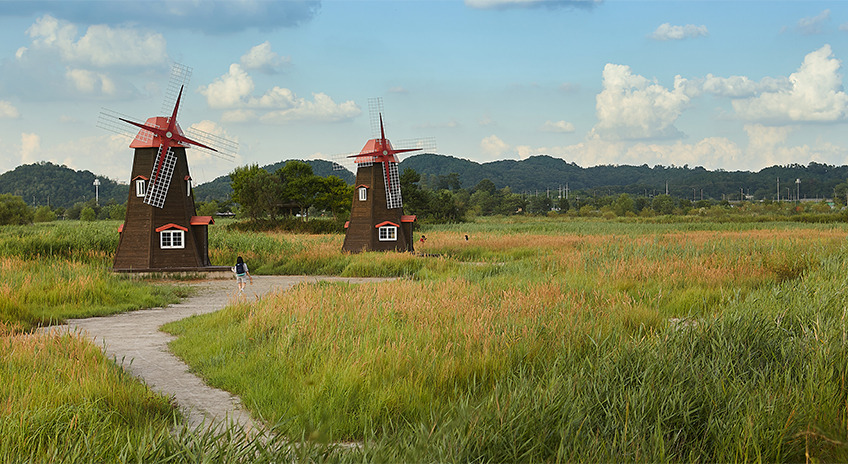 갈대숲 사이로 산책로가 이리저리 흩어졌다 모이기를 반복하며 공원의 중심부로 사람들의 발길을 모은다. 풀벌레들의 노랫소리가 한꺼번에 들려와 종류를 헤아리기 어렵다. 바닥에는 작은 개미와 큰 개미가 뒤섞여 나뭇잎을 물고 가고 새들이 풀숲에서 날아 오른다. 초원의 한복판에 풍차가 천천히 바퀴를 돌리며 서있다. 인천에서 만날 수 있는 가장 좋은 산책로는 이곳임에 틀림 없다.