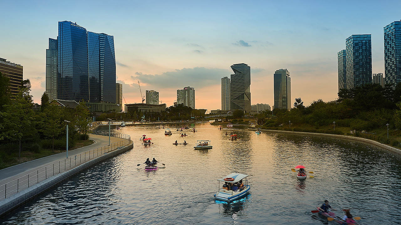 신도심에는 온통 새로운 것으로 가득하다. 잘 정돈된 도로를 따라 높은 건물들이 균일한 높이로 지평선을 이룬다. 자칫 무미건조해 보일지도 모를 빌딩숲 사이로 야트막한 언덕이 초록빛을 발한다. 꽤 많은 사람들이 나무 그늘 아래 앉아 쉬거나 호수를 따라 난 산책로를 걷고 있다. 해가 지기 시작하니 호수엔 카약과 보트에 매달린 전등 빛들이 형형색색 빛난다. 호수 변에 앉아 버스킹을 하는 음악인이나 바라보는 이들이나 해가 지는 것을 신경 쓰지 않는 것처럼 보인다.