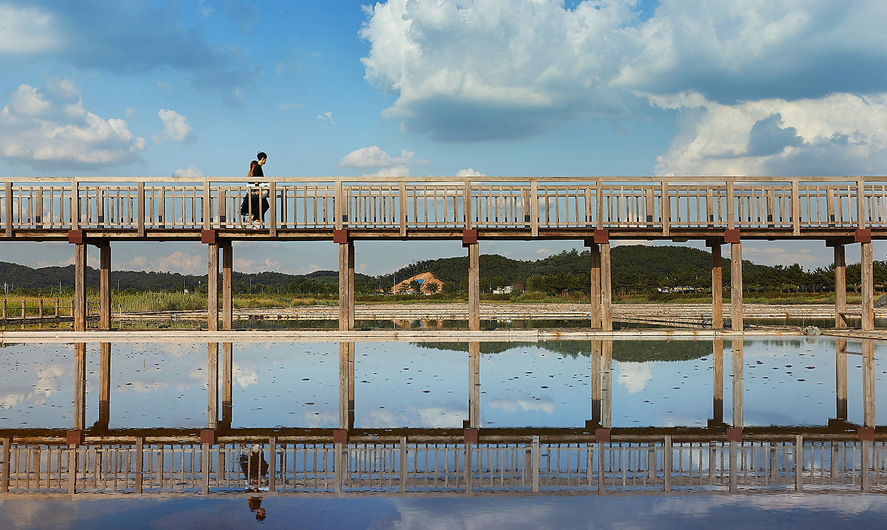 좀 더 걸어 들어가 폐염전을 복구한 염전학습장에서는 실제로 소금이 만들어지는 과정을 생생히 관찰할 수가 있다. 넓은 염전 위를 가로지르는 다리 위를 오르면 찰랑거리는 바닷물에 가득 담긴 푸른 하늘이 눈을 시원하게 한다. 사진을 찍느라 커플들의 걸음이 느려지는 곳이기도 하다.