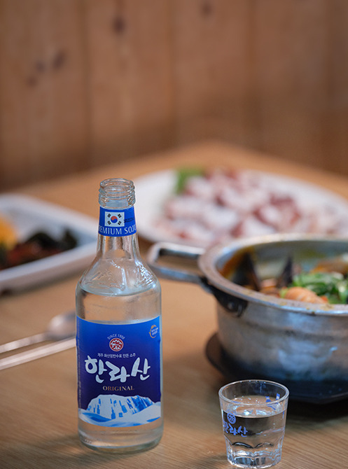 전통적으로는 증류식으로 만들던 소주는 근대 들어 희석식으로 대량생산되고 있다. 오늘날 국민주로도 불리우는 소주가 바로 희석식이다. 노릇하게 구워진 삼겹살, 싱싱한 회 한 접시, 라면 한 그릇, 그 어디에나 잘 어울리는 술이다. 대한민국 8도 지역마다 다른 소주를 제조하고 있으나 제주도의 소주는 더 특별한 면이 있다. 일반적으로 소주는 초록색 병에 담겨 있지만, 제주도 지역소주인 ‘한라산’은 투명한 병에 담겼다. 도수는 비교적 약간 높지만, 제주의 화산암반수에서 오는 깔끔한 물 때문에 목 넘김이 부드럽다. 제주를 방문하는 이들에게 소주의 신세계를 선보이며 고정적인 팬층을 늘려가고 있다.