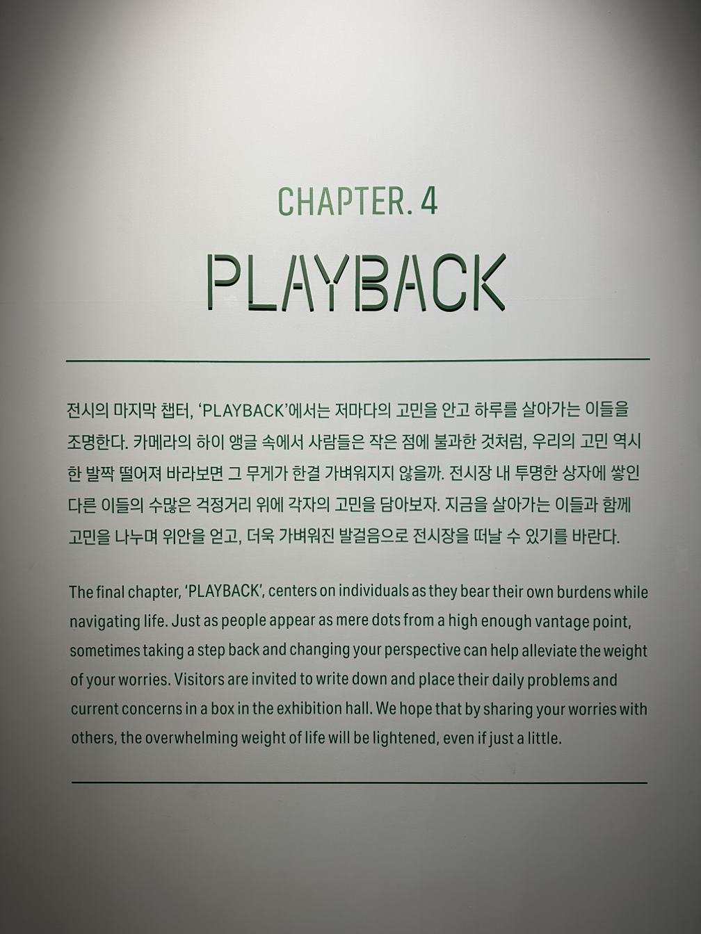 마지막 챕터에서는 작품들을 돌아보며 사유하게 한다. 멀리서는 작은 점에 불과한 존재들처럼, 매일 안고 사는 고민들도 멀리서 바라보면 무게가 가벼워지지 않을까.