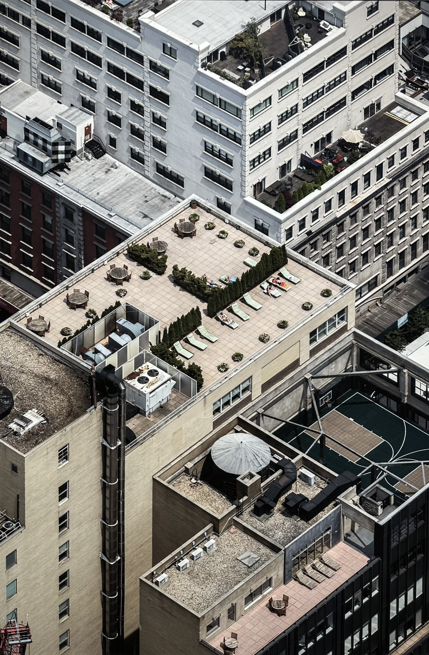 맨해튼 일대에서 찍은 사진들. 루프탑에서 휴식을 취하는 사람들이 보인다. 작가는 건물이란, 유기체들을 연결해 주는 매개체와도 같은 곳이라고 표현한다.