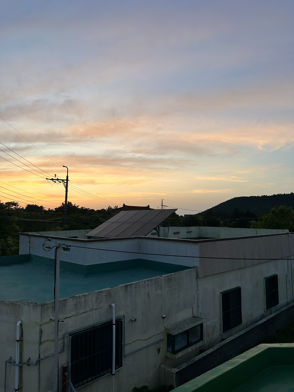 방에 짐을 풀고 나니 멀리서 노을이 피어오른다.