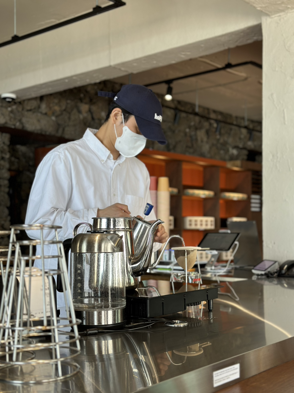 제주에 도착하고 처음으로 향한 곳은 융드립 커피로 유명한 카페 '홉히'. 돌담을 연상시키는 인테리어부터 제주스러움을 느낄 수 있고, 개방형의 바테이블에서 커피 내리는 모습을 볼 수 있다.