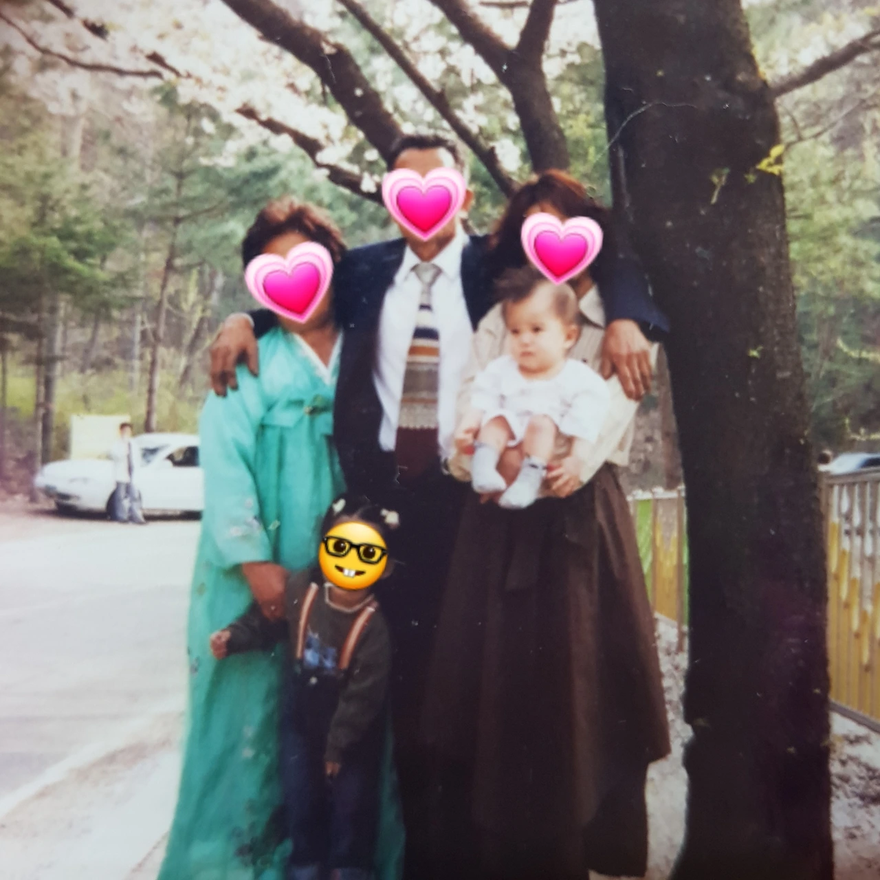 조부모님, 엄마, 언니, 저입니다. 아기일 때부터 머리카락이 희한하게 자랐습니다.