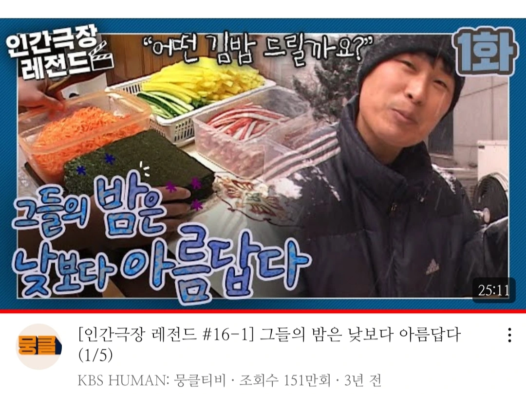 <유퀴즈 온 더 블럭>은 가족 모두가 보고 싶어 하고, <동물농장>은 부모님과 내가 애정하며, <인간극장>은 나의 최애 프로그램이다. 동시에 막내로서 내미는 비장의 카드이기도 하다. '다시 보기'로 트나, <인간극장>은 평일 아침에 방영되는 특성상 5부로 쪼개져 있다. 다른 두 방송은 한 편이 끝나기 전에 밥을 다 먹는데, <인간극장>은 밥 먹는 도중에 1부를 끝까지 볼 수 있다. 급 톤이 높아진 내레이션과 특유의 엔딩곡이 울려 퍼지면 2부가 궁금해지고, 2부 끝나면 3부도 보고 싶어지고, 끝내는 5부를 한 자리에서 다 보게 되는 경우가 발생한다. 다시 보기 기능으로 시청하는 거라 끊어 봐도 상관은 없다. 이는 중독의 문제다.