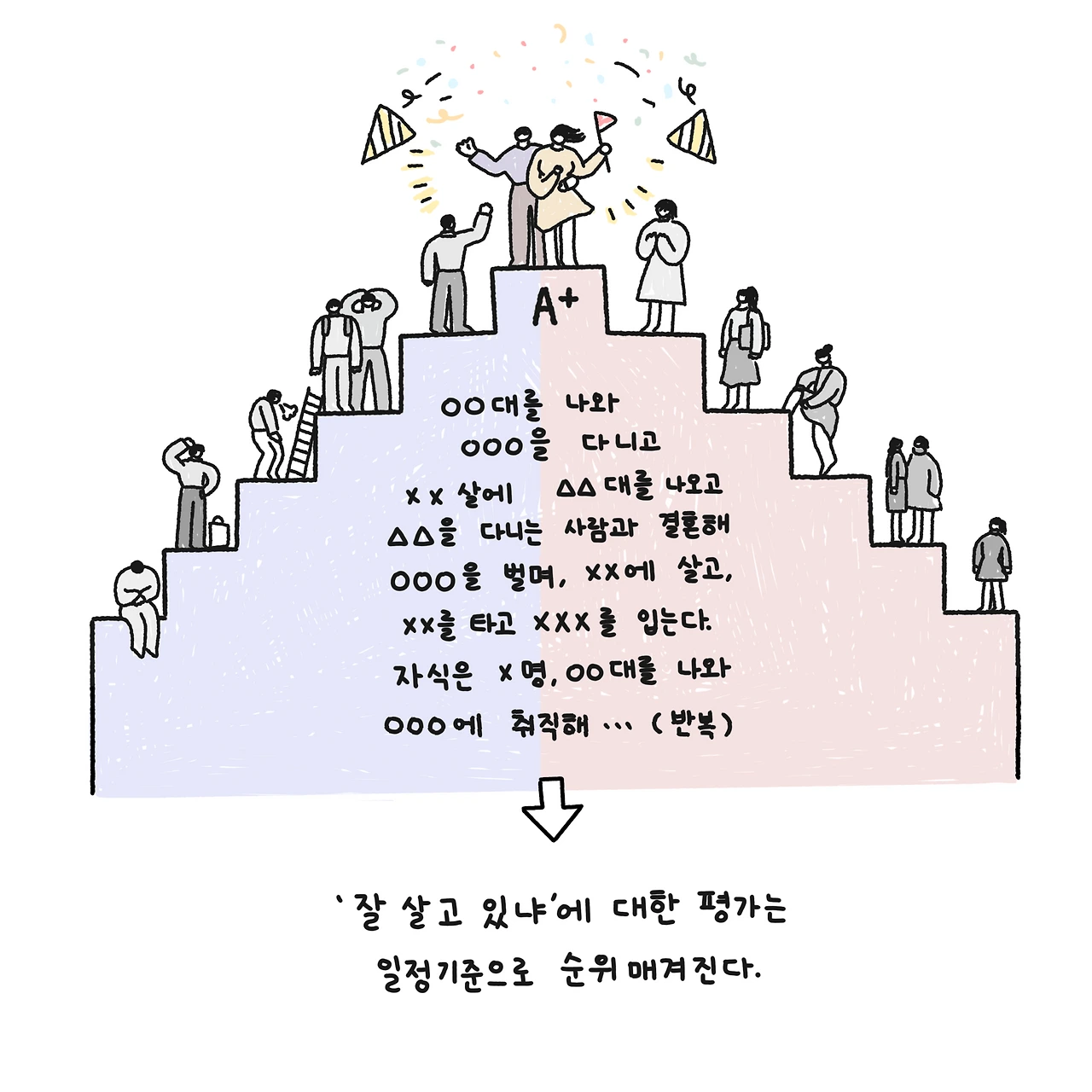 모두들 10살, 20살, 30살, 40살, 50살, 60살, 70살.. 그 나이 때에는 꼭 해야 하는 것처럼 느껴지는 '통과의례'를 향해 경쟁하듯 앞을 향해 너도나도 앞으로 달려 나간다. 학생 때에는 모두들 다 나랑 똑같은 교복을 입고 있었고, 같은 밥을 먹고, 같은 수업을 듣고, 같은 목표를 갖고 있었다. 그런데 너나 나나 다 똑같이 보이던 그 사람들은 나와 같은 시간 속에 나이를 먹어가다 어느 순간부터 성공과 목표 달성에 차이가 나기 시작하고, 그 목표 달성의 기록이 축적된 것들로 '삶을 잘 살고 있느냐'에 대한 평가가 순위 매겨지기 시작했다.