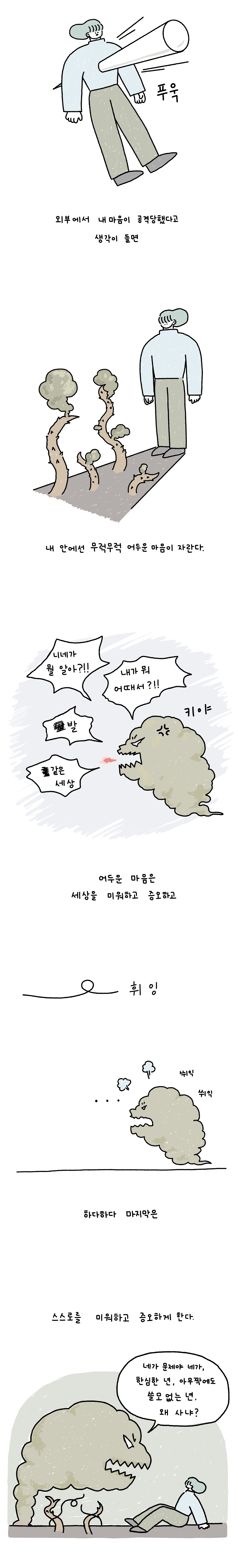 나는 밖에서 마음에 상처를 받으면 우선 그 자리에서 실컷 당하고만 있다 집에 와서야 분에 못 이겨 혼자 마음속으로만 쌍욕을 날린다. '너네가 뭔데? 씨발!' '너네가 날 알아? 왜 나한테만 가혹한 건데?'