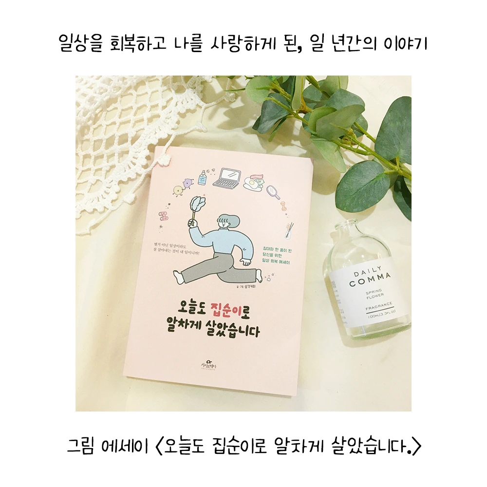 책은 우울하고 무기력한 집순이가 일상을 회복하고 나를 사랑하게 되는, 그림 에세이랍니다.