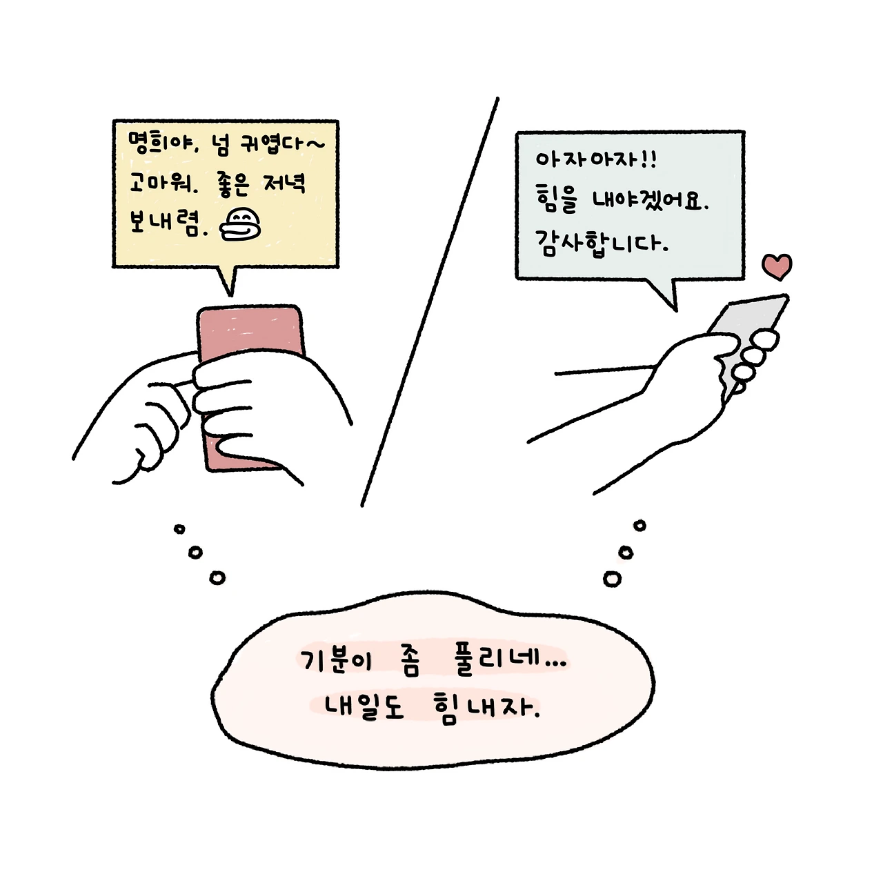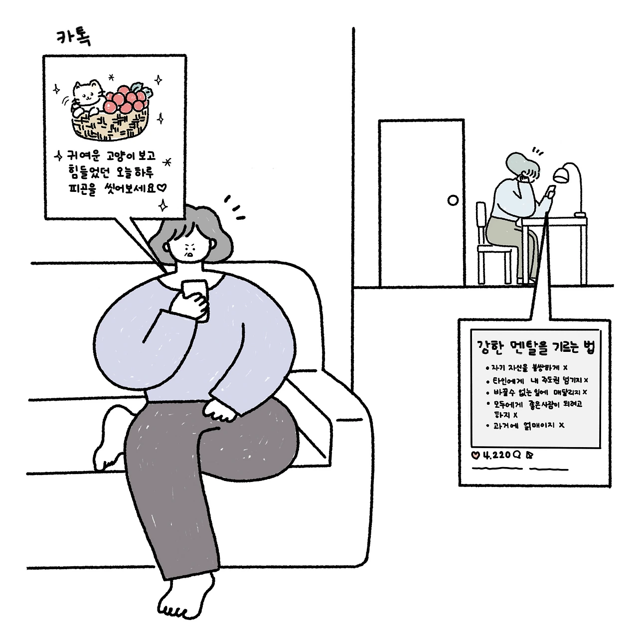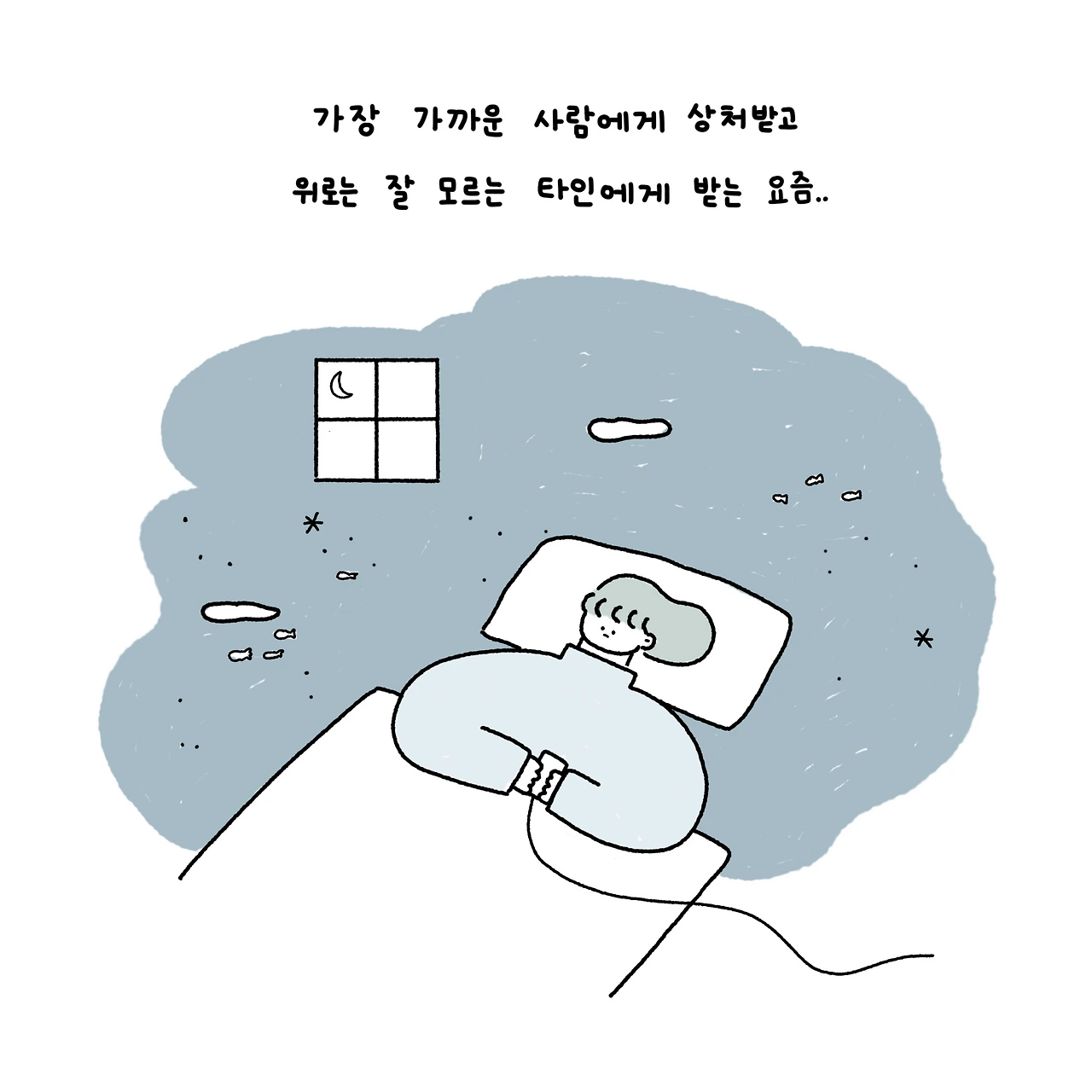 방안에 찌그러져 핸드폰을 켜 sns를 기웃거린다. 막 퇴사하고 나와 시작한 백수생활을 어떤 이의 글을 읽는다. 공감도 되고 웃프기도 하고 피식 웃음도 나오는 글도 있다. 우울한 어떤 이가 그린 공감툰도 본다. 자존감을 기르는 방법도 찾아본다. 그런 것만 찾아보니 맨탈을 강하게 하는 법도 추천 피드로 뜬다. 화면 속 누군가의 글과 그림은, 우울한 사람에게 넌 왜 별거 아닌 걸로 우울하냐고 타박하지 않으며, 작은 것에도 행복해한다. 지치고 방향을 모르겠는 사람에게 너 따위가 꿀 꿈은 없으니 정신 차리라는 야박한 질책보단 말보단 포기하지 말라고, 너 자신을 믿으라 한다.