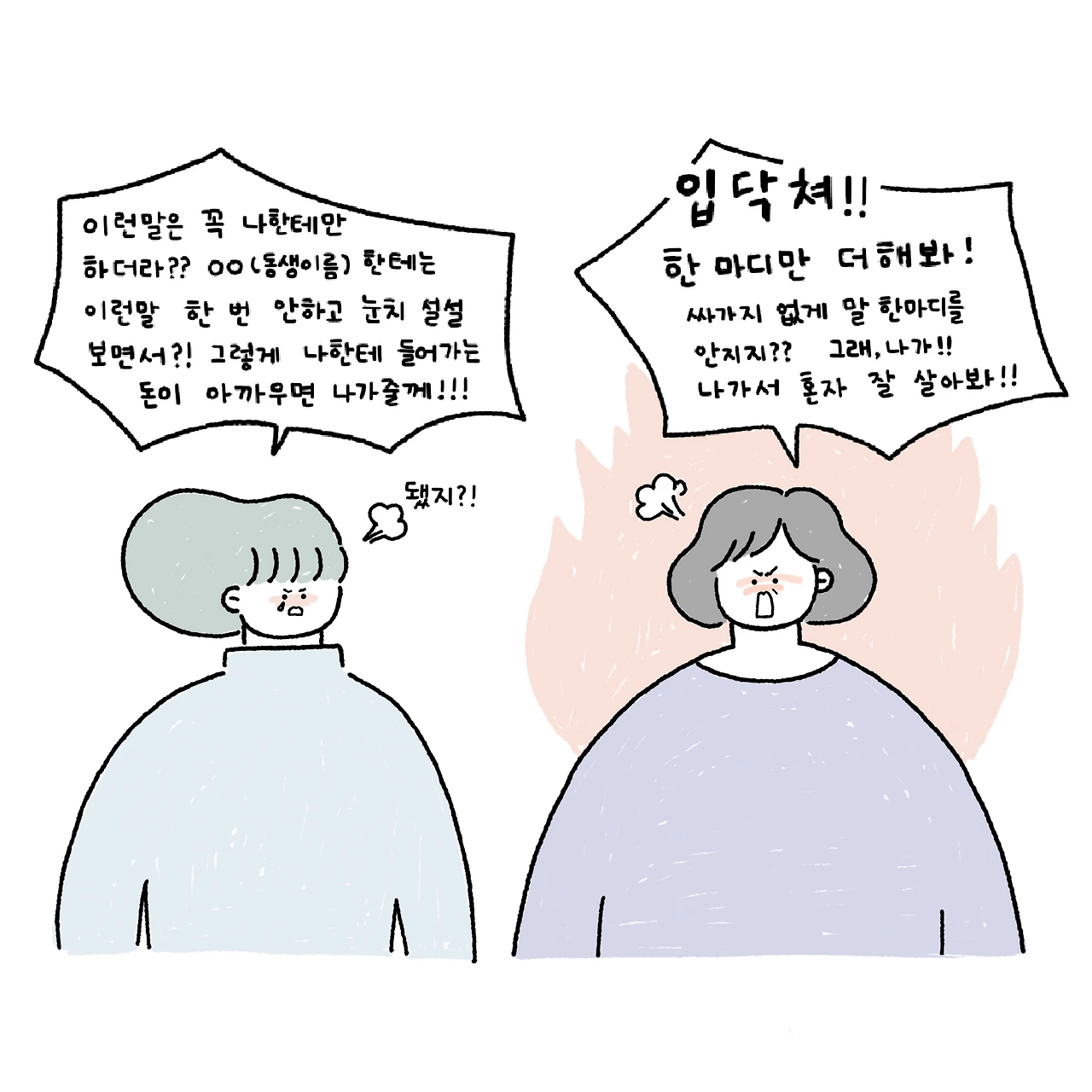 이런 말들을 들어도 예이~하며 마음게 크게 두지 않았다. 나는 내 페이스가 있고 엄마 기준에 맞춰 나를 억지로 바꾸려 하지 말자. 결심이 흔들리지 않고 걸어가 보자, 하며 마음을 다잡으며 무시하고 마음에 담아두지 않으려 했다. 그런데 며칠간을 마주칠 때마다 듣는 말이라곤 이런 말뿐이고, 나도 적자로 마감을 찍고 퇴근하자마자 그런 소리를 들으니 서러웠던 마음이 한순간 욱하니 올라와버렸다. 어이없는 엄마의 논리에 대한 반박과 지금까지 마음속에 있던 서러움이 합쳐져 엄마 말에 나도 감정적으로 끝까지 대답했다. 그 결과는?
