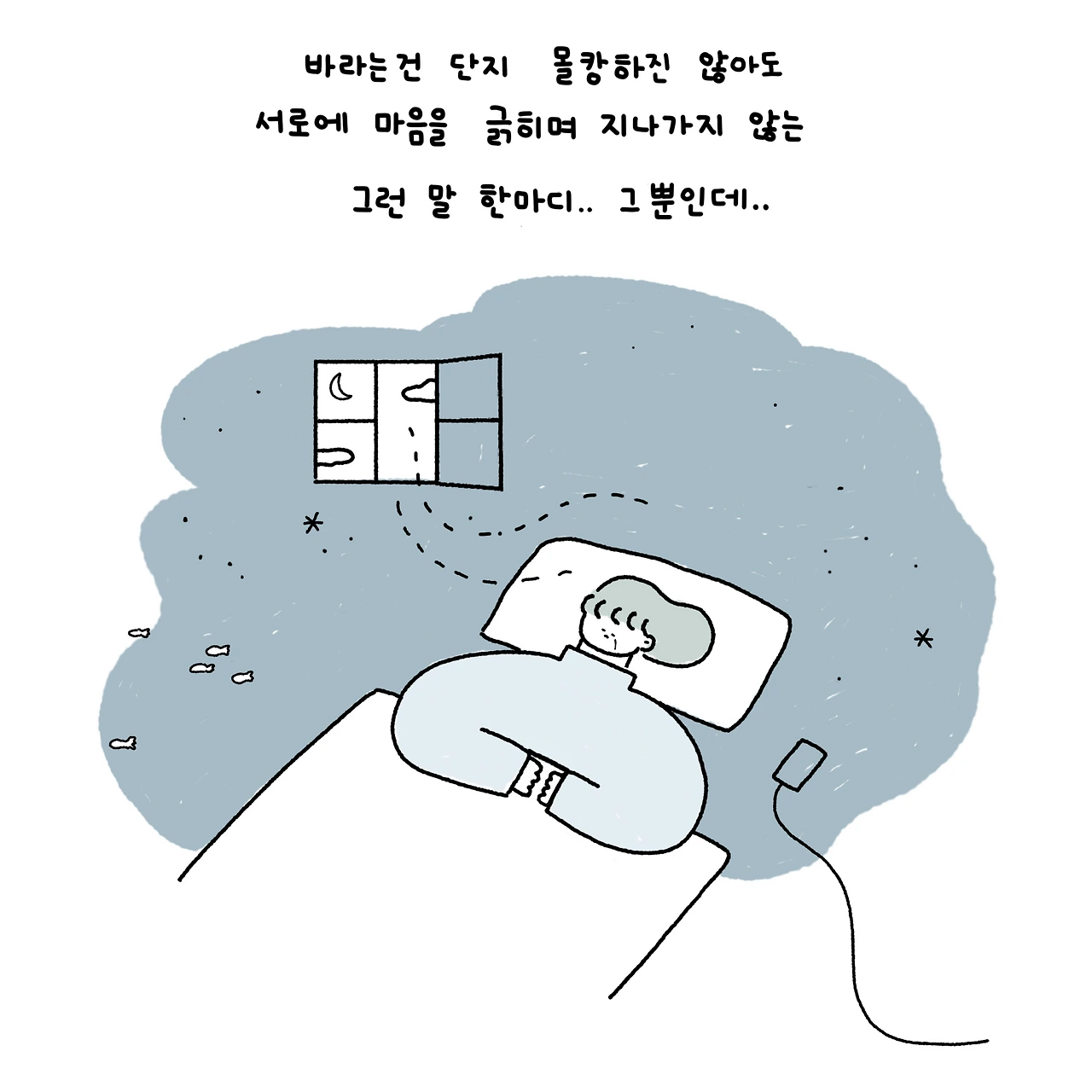 이제와 대단히 화목하고 따뜻한 관계를 꿈꾸진 않는다. 내가 바라는 건 단지 몰캉하진 않아도 차갑지 않은 그런 보통의 대화. 그리고 서로의 마음을 긁히며 지나가지 않은 그런 수수한 말 한마디, 그뿐이다.