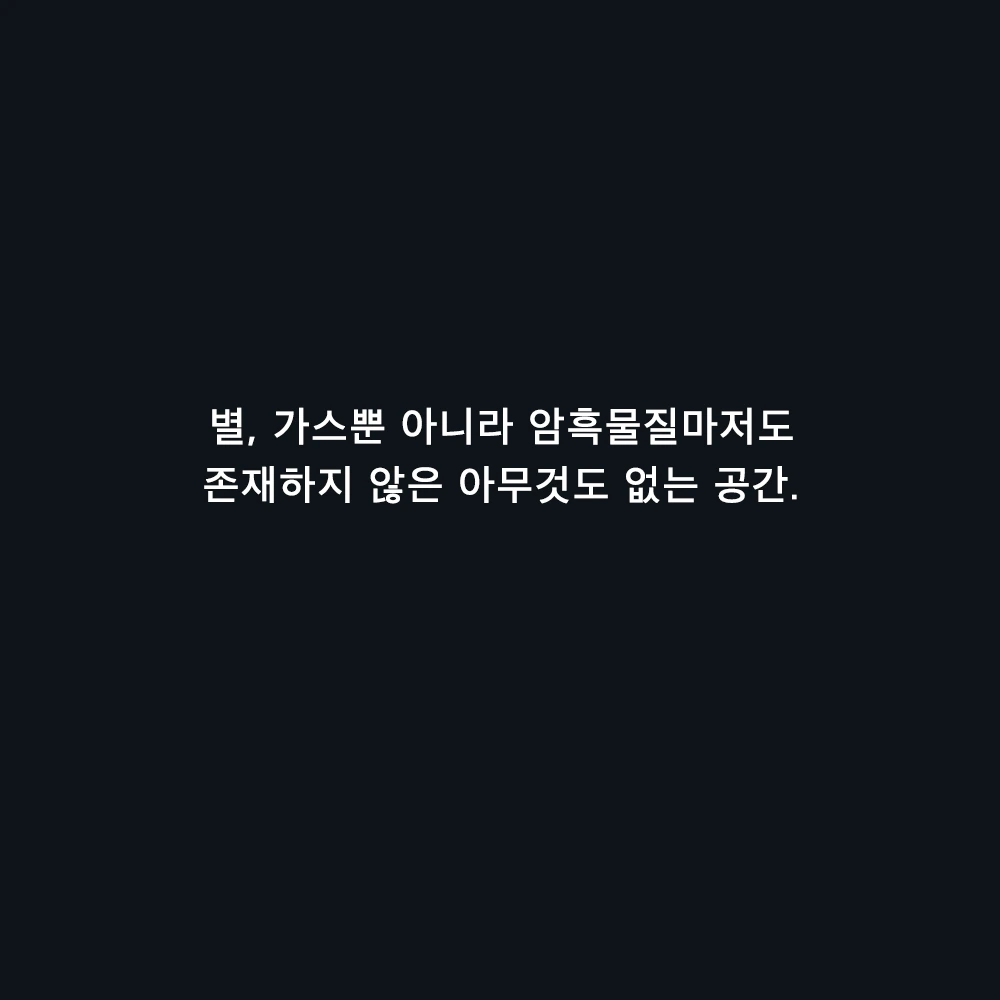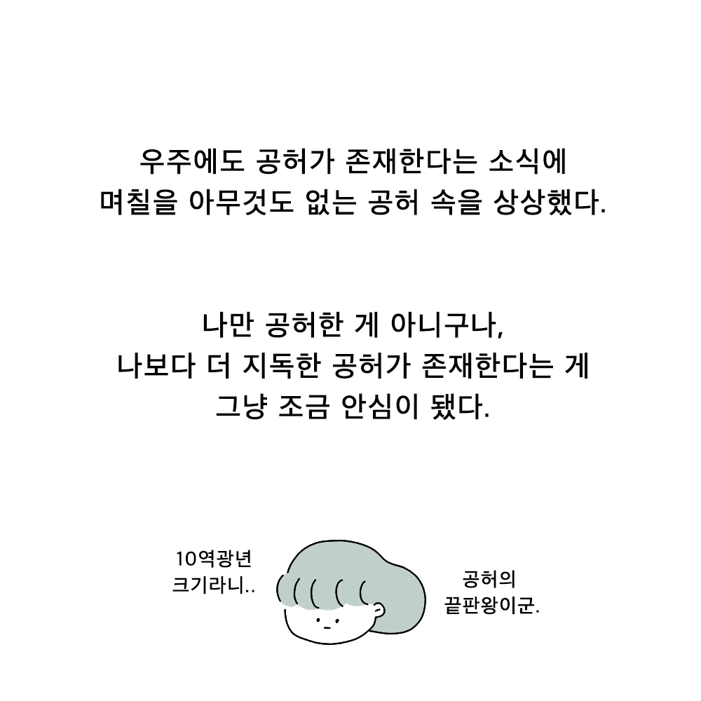 억지로 내가 유재석 같은 사람은 될 수없다. 난 INFJ인 내 성격유형이 싫어 몇 년 간 수시로 성격검사를 다시 해보지만 달라진 적이 없다. 쉽게 성격이 바뀌진 않는 것 같아 이제는 나는 이런 사람이구나 인정하며 살고 있다. 단지 이제는 이 '공허함'이 내가 부여하는 의미에서 파생된 것임을 안다. 진짜 공허를 보며 내가 가진 내 마음의 공허 또한 유에서 창조되었고, '나'라는 우주가 존재함에 만들어진 것임을 안심한다. '거대 우주 공허'에 위로받으며 나의 하루를 살아갈 뿐이다.