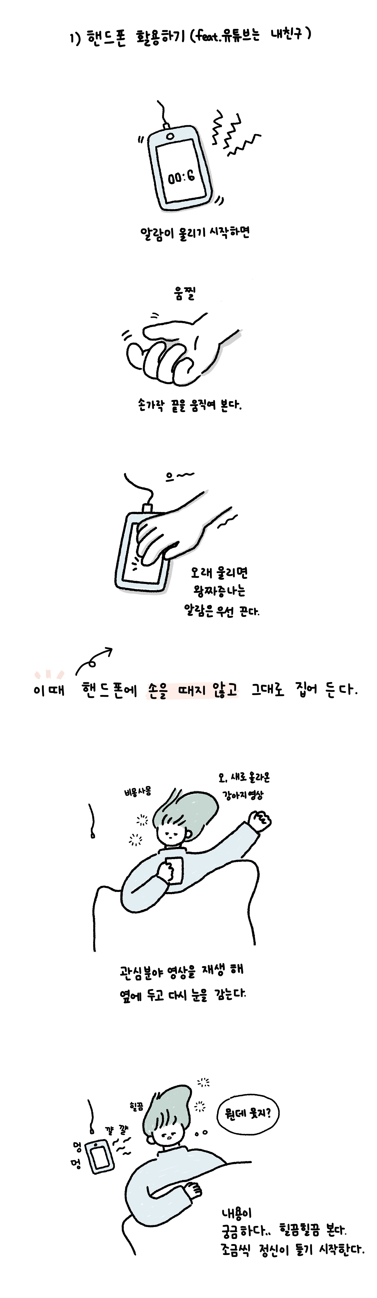 일을 다닐 때는 억지로 일어나야 하는 알람 소리가 한 음절만 울려도 짜증이 났다. 그래서 백수가 된 다음부터는 알람을 다 삭제하고 내가 잠에서 깨고 싶을 때까지 자다가 일어났었다. 그러다 허리가 아플 때까지 잠을 자고 오후 3시에 일어나는 반복을 하고 나니, 내가 졸려서 누워있는 게 아니구나. 몸은 더 이상 잠을 원하지 않았구나 생각이 들었다. 마음을 고쳐먹고 처음에는 알람을 하나를 맞춰두었다가 잘 되지 않자, 10분 간격으로 두 개 정도 다시 맞춰놨다. 알람 소리가 울리고 약간 비몽사몽 한 느낌이 들면 손을 움직여 시간을 보고, 실시간 검색어를 보며 잠에서 깨어본다. 손을 뻗어 핸드폰을 잡고 손가락이 움직이는 상태가 되면 이제 불편한 자세로 누워 눈을 감고 있는다. 유튜브라도 틀고 내가 관심 있는 뭐라도 켜서 듣는다. 듣다 보면 궁금해지고 눈을 떠서 슬쩍슬쩍 보게 된다. 그러다 보면 정신이 조금씩 든다. 이제는 눈을 뜨고 힘을 주어 일어나야 할 순간이다.