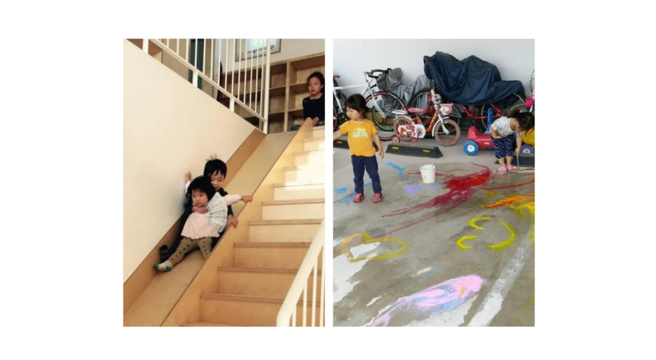 그 아래 부분의 필로티는 도로와 마당 그리고 공원을 연결해주며, 그네가 달린 아이들 놀이공간이 된다. 각각의 집에서 연결되는 2층의 놀이방은 다양한 관계를 통해 두 집의 삶을 좀 더 가변적으로