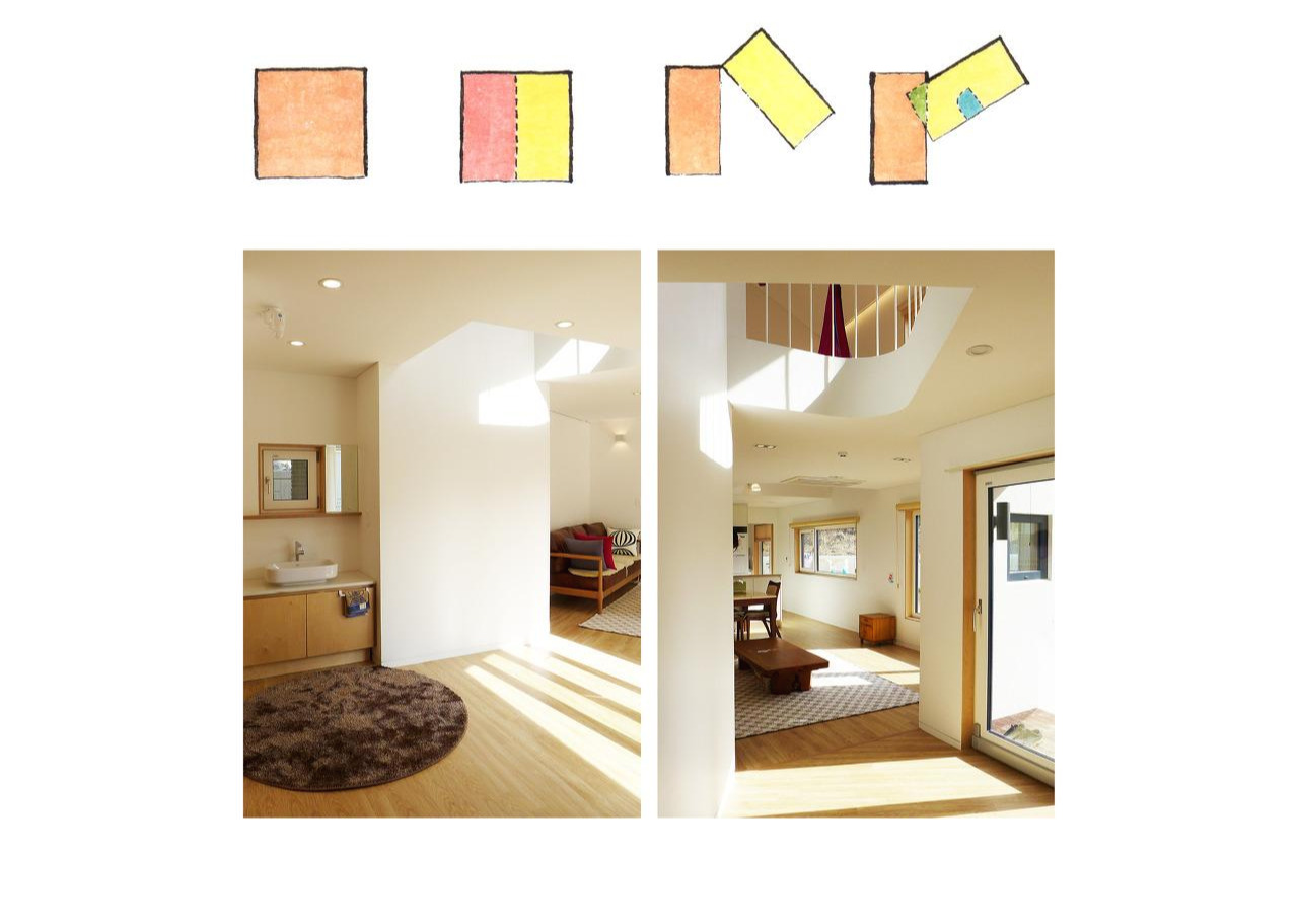 아빠의 공간, 딸의 공간, 엄마의 공간 그리고 손님의 공간이 2층 집 안에서 다양한 방식으로