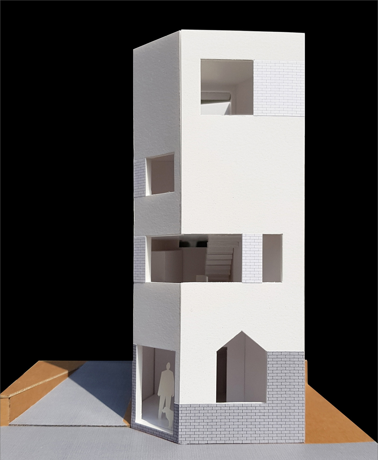1층에는 작은 가게를 구성하였고, 대지의 고저차를 이용해서 주택 내부 계단 아래공간은 층고를 확보한 화장실을 구성하였다. 대지의 높은 부분에 형성된 주택 현관을 들어서서 한 층을 오르면 2층에는 작은 거실과 식당주방이 있다. 그리고 남측에 형성된 계단은 4층까지 이어져 있으며, 3층에는 침실과 화장실 그리고 4층에는 정북일조로 인해 셋백(setback)된 공간을 활용한 작은 테라스와 서재가 있다. 그리고 북측 모서리부분을 활용하여 책장을 겸하는 돌음계단을 설치하여 옥상테라스를 이용할 수 있도록 하였다.