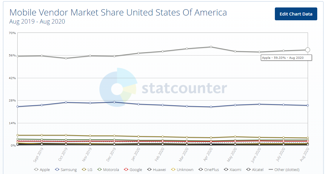 미국에서 아이폰의 점유율은 59.33%로 10대 중 6대가 아이폰이다. 친구들에게 파랑풍선 메시지(애플끼리는 파랑, 타사는 초록)를 보내고 FaceTime으로 통화하며 동질감을 얻고, 교내 협업(학교에 아이패드 및 맥북 비치)을 하려면 애플이 낫다. 미국에서 이제 필수품의 영역으로 넘어간 듯 보인다.