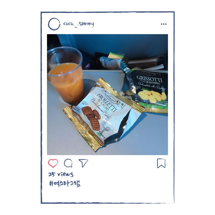 내가 외항사를 이용할 때 정말 좋아하는 시스템 중에 하나는 승무원을 불러서 요깃거리를 주문하는 게 아닌 맘 편하게 직접 가져다 먹을 수 있는 스낵바 시스템이다. 기내식을 즐겁게 먹었다.라던가 전부다 먹어 치웠다. 같은 기억은 별로 없는데 이상하게 기내에서 간식을 먹는 일은 너무 즐겁다. 알이탈리아 항공은 샌드위치와 과자 그리고 음료가 스낵바에 있었는데, 엄마랑 어찌나 신나게 가져다 먹었는지, 삼삼한 맛의 과자가 엄마랑 내게 정말 취향 저격이었다. 게다가 비건을 위한 과자도 있다니. 몇 개를 안 먹고 챙겨 스페인에 가져가서까지 먹었으니. 세보 지는 않았지만 우리 도대체 몇 개를 먹은 걸까? 모 항공사는 *라면 컵라면도 스낵바에 있다고 하는데 채식주의자인 나야 당연히 먹을 수 없겠지만, 엄마미에게는 소개해 주고 싶달까? 기회가 된다면 *라면 컵라면이 스낵바에 있는 항공사도 이용해 봐야겠다.라는 생각이 들었다. 우리 엄마미 내 몫까지 가져다 먹을지도?