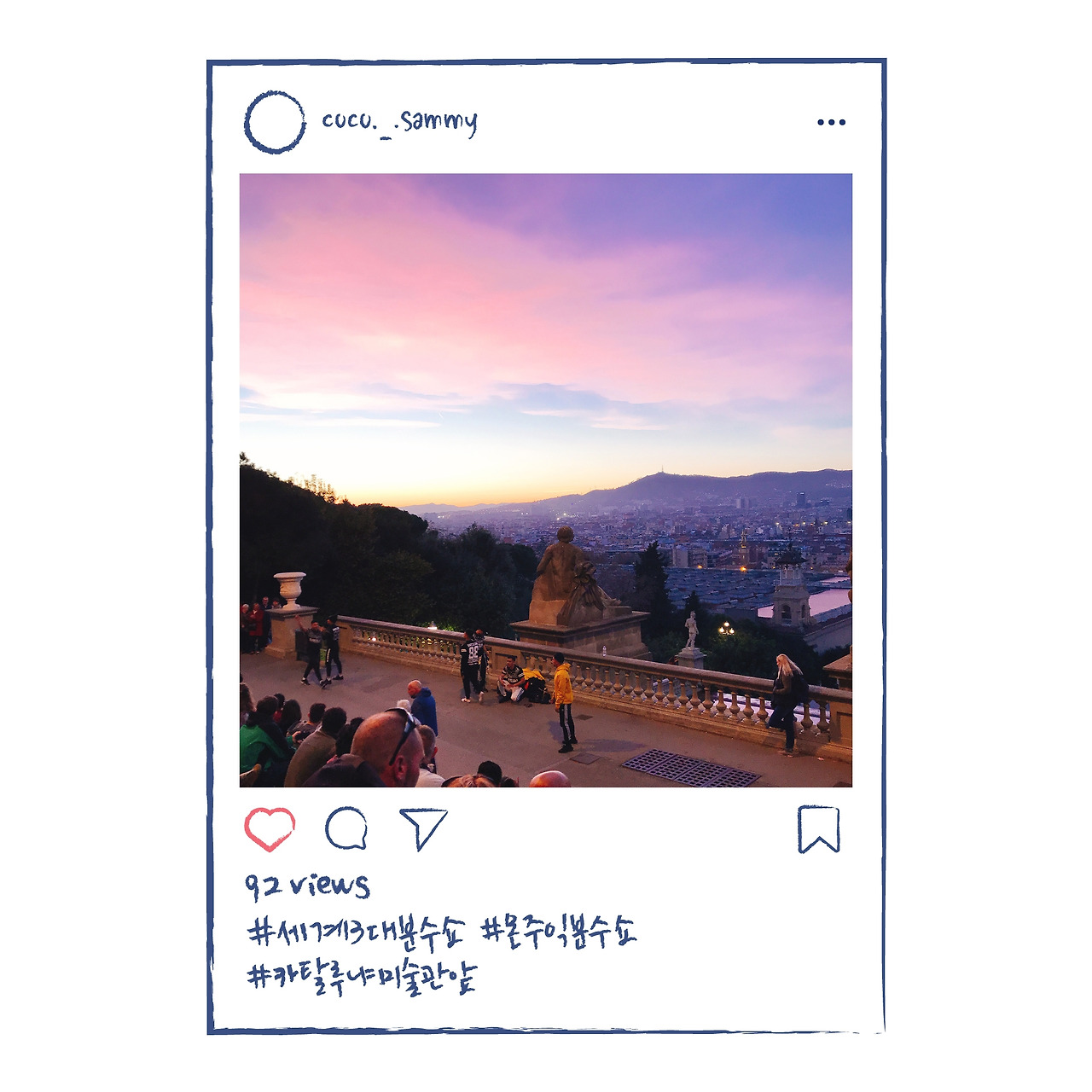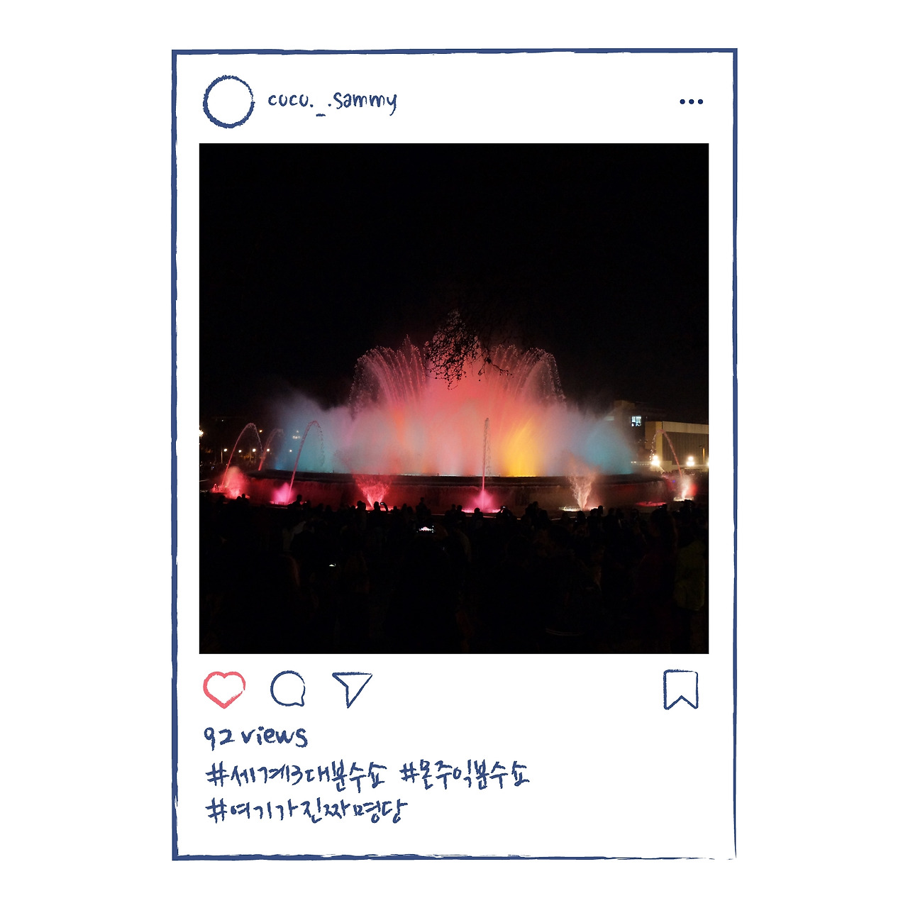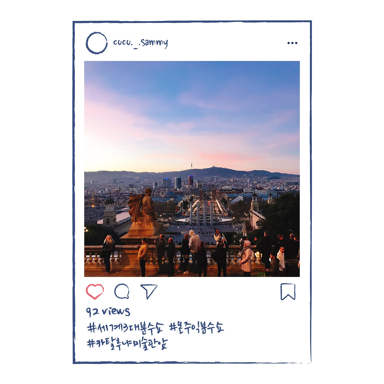 람블라스 거리에 있던 숙소에서부터 시작해 개선문, 피카소 미술관, 호프만 베이커리, 별다방, 현대미술관, 구엘 저택 그리고 라 보케리아 시장까지 모두 도보로 이동했던 우린, 세상에! 몬주익 언덕까지 또 걸어서 이동했다. 엄마미와 편하게 여행하겠다며 바르셀로나 카드까지 구매해놓고 또 걸어서 이동하다니. 혼자 헝그리 정신으로 여행하던 습관이 이렇게 무섭다. 그런데 생각해보면 우리 엄마미의 체력도 이 세상 에너지는 아니었던 것 같다. 우리가 몬주익 언덕으로 발걸음을 향한 데는 바로 세계 3대 분수 쇼인 몬주익 분수쇼를 보기 위함이었다.
