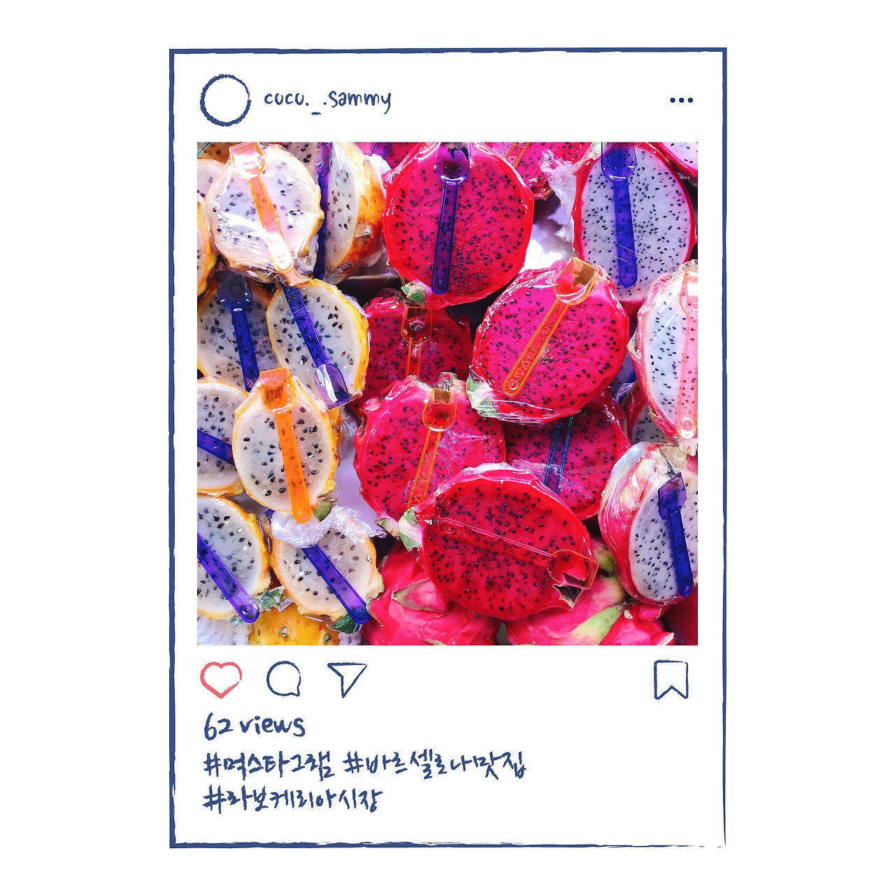 당시에도 살짝 느꼈지만, 한국에 와 찍은 사진들을 찬찬히 들여다보니 확실히 느껴졌다. 개선문에서 찍은 사진 속 엄마미와 피카소 미술관에서 찍은 사진 속 엄마미의 표정이 확연히 다르다는 걸. 어르신들이 많이 가는 패키지여행 코스에 왜 미술관, 박물관이 없는지 알겠더라. 물론 난 좋았다. "엄마미 미안." 그런데 우리 둘 다 첫날 일정 중 너무 좋아했던 곳이 있다면 역시 시장이었다. 라 보케리아 시장은 내가 전 세계를 여행하며 가본 어떤 시장들보다 컸고 종류가 다양했다. 너무 다양해서 도대체 뭘 사 먹어야 좋을지 모를 정도였다. 게다가 우리 모녀는 과일 킬러. 그중에서도 우리의 호기심을 자극한 과일은 붉은 용과였다. 용과 하면 흰색에 검정 씨가 콕콕 박혀 있는 것만 생각했는데, 붉은빛을 도는 용과가 있다는 게 신기했다. 맛은 이미 알고 있는 바로 그 맛이었지만. 한국에서는 비싸서 쉽게 사 먹기 힘들었던 과일과 샐러드를 잔뜩 사 가지고 다음 일정을 위해 몬주익 언덕으로 발길을 옮겼다.