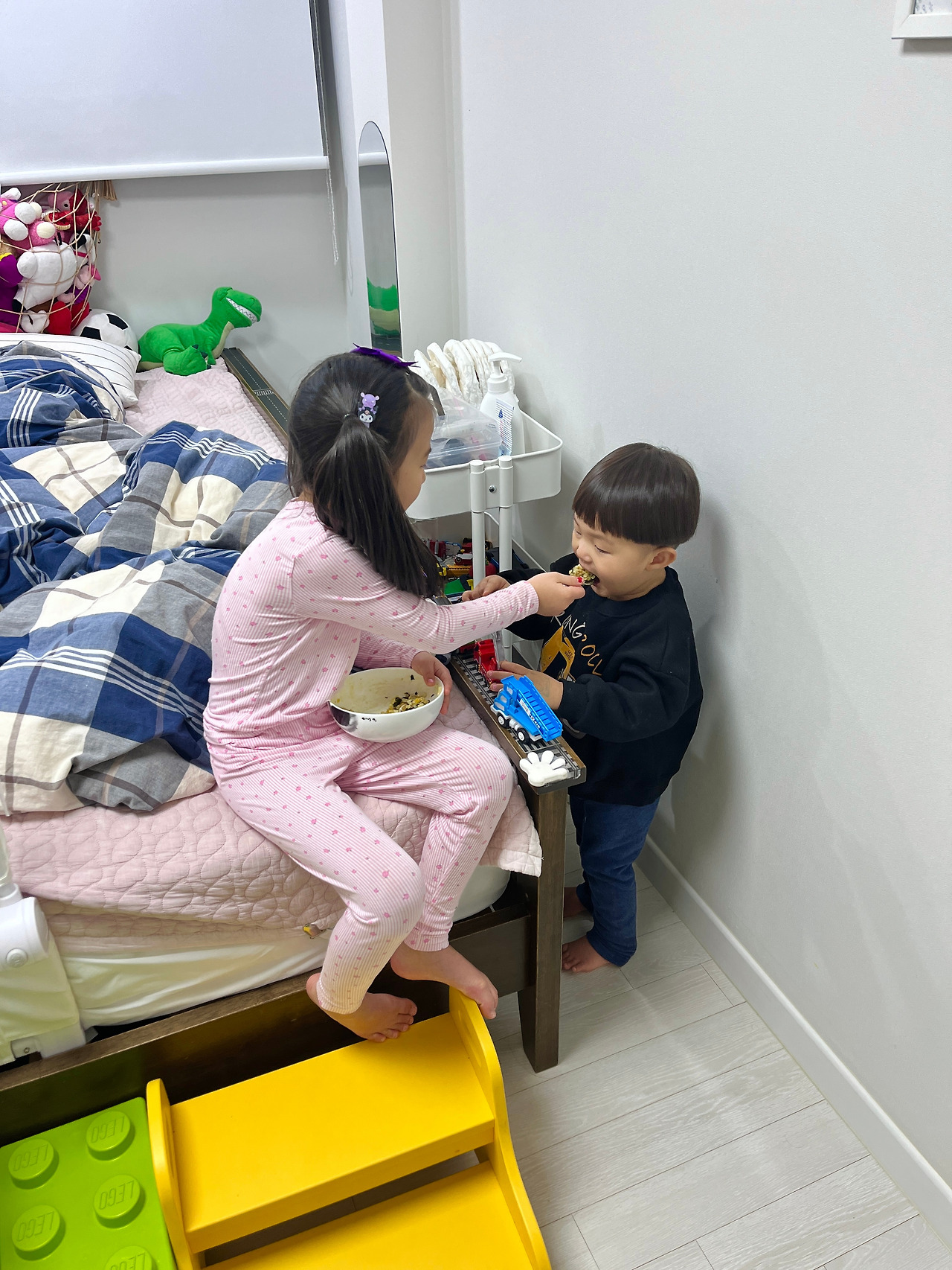 딸 하나에 아들 하나를 두었다고 하면, "금메달이네" "200점이네" 하고 말씀하시는 어른들을 만난다. 자식을 몇을 낳고 성별을 어떻게 낳느냐가 어떻게 점수와 순위를 매기는 일이 될 수 있겠냐만은 어른들은 신기하게도 그것에 대한 나름의 규칙이 있는 듯하다. (아님 그냥 누구에게나 그렇게 말씀해 주시는 것일지도;) 하지만 나에게 있어서는 가을이가 내 딸이라는 것이, 그리고 그런 가을이가 여름이의 누나라는 것이 바로 금메달인 것 같다. 오늘 저녁에는 아이들에게 계란밥을 해주었다. 그런데 식탁에 앉아서 반쯤 잘 먹던 여름이가 갑자기 방에 들어가 자동차 장난감들을 가지고 놀기 시작했다. 여름이의 그 행동은 전혀 놀랍지 않았다. 내가 놀랐던 것은 그다음 가을이의 행동이었다. 내가 부엌을 정리하느라 정신없는 사이 가을이가 계란밥을 한 숟갈 떠서 방에 들어가 여름이를 먹이고 온 것이었다. 그러고는 뿌듯한 표정으로 "내가 주면 잘 먹어!^^" 하는 게 아닌가. 나중에는 (자기 밥을 다 먹고) 아예 여름이가 남긴 밥을 그릇째 들고 들어가 여름이 옆에 앉아 먹이기 시작했다. 여름이는 정말 놀면서 누나가 주는 밥을 잘도 받아먹었다. (결국 그렇게 방에서 놀면서 나머지 반그릇을 다 먹었다.) 밥이 먹기 싫어서라기보다는 어느 정도 배가 찼으니 놀고 싶어서 방으로 들어갔던 모양이다. 동생을 저렇게 챙겨주는 가을이의 행동은 어디서 나오는 것일까. 가르친 적이 없는 나는 볼 때마다 놀란다. 가을이가 여름이를 엄마처럼 챙겨줄 때마다 드는 생각은 '김여름 너는 좋겠다. 누나가 가을이라서'인데, 오늘은 '장새미 너는 좋겠다. 딸이 가을이라서'다. 나는 오늘도 가을이 덕에 '갓생'산다.
