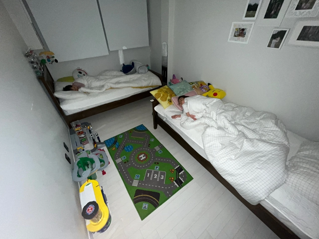 나는 아이들이 신생아일 때부터 아이들과 다른 방에서 잠을 잤다. 즉, 분리수면을 했다. 다만, 아이들이 잠들기까지는 옆에 누워 있어 주다가 아이들이 잠들면 나는 안방으로 넘어오는 식이었다. 지금은 아이들이 같이 한 방에서 자기는 하지만 각자 다른 침대에서 자기 때문에, 옆에 누워 있어 주는 게 조금 애매해졌다. 내 몸은 한 개인데 애들은 둘이라 그렇다. 그래서 남편이랑 한 명씩 나눠서 같이 누워 있어주기도 하고, 한침대에서 셋이 누워 있다가 첫째가 잠들면 침대로 옮겨주는 식으로 하기도 했다. 첫째는 금방 잠이 드는 편이라 양쪽 침대 사이 바닥에 앉아 있다가 첫째가 잠들면 둘째 옆에 가서 누워 있어주기도 하고 말이다. 그런데 지난 금요일부터 둘째 침대 위로 올라가 주지 않는 것을 해보기로 했다. 난 끝까지 아이들 침대 사이 바닥에 앉아서 잠들기까지 기다려보기로 한 것이다. 첫날은 둘째가 옆에 누워 달라고 조르다 조르다 울기도 했다. 나에게 말이 안 통하자 아빠랑 자겠다고 울었는데, 그래도 나는 침대로 올라가 옆에 누워주지 않았다. 어차피 옆에 누워 있어 줘도 늦게 자는 건 마찬가지인데 버텨보자 싶었다. 대신 침대 밑에 앉아 한쪽 손으로 아이를 도닥여주기는 했다. 아이는 우는 것도 안 통하자 내 한쪽 팔을 자기 몸에 얹어놓는 것으로 만족하며 잠이 들었다. 성공한 것이었다. 재우는데 1시간 정도 걸렸던 것 같지만, 그거야 뭐 옆에 누워 있어 줘도 그렇게 걸리기는 마찬가지이니 나는 나름대로 매우 성공적이라 생각했다. 두 번째 날은(토요일은) 둘째가 계속 옆에 누워 달라고 조르긴 했지만 울지는 않았고, 내 팔에 얼굴을 기대기도 하고 계속 앉아서 일어나기도 했지만 결국 조르다 포기하고 아이는 잠들었다. 1시간 까지는 안 걸렸던 것 같다. 어쨌든 성공적이다. 그리고 오늘. 3일째다. 나는 바닥에서 기다리겠다고 하고 앉았다. 아이는 또 조르기 시작했고, 옆에 안 누워 줄 거면 토닥토닥이라도 해달라길래 침대 옆에 앉아 그렇게 해주었다. 그런데 조금 있다가 옆으로 돌아눕더니 혼자 잠드는 것이었다. 어제보다 시간도 대폭 줄었다. 이렇게 3일 연속 성공하다 보니, (게다가 갈수록 잠이 드는 시간도 빨라졌고) 어쩌면 내가 옆에 누워 있는 게 아이가 잠들기 더 어려운 구조였을 수도 있겠다는 생각이 들었다. 내가 옆에 누워 있으면 나에게 말도 더 걸고, 나에게 더 기대면서 움직이기도 하느라 잠을 더 안 자는 구실이 되는 것이기도 했겠다는 생각이 들었다. 그래서 당분간은 이 콘셉트를 밀고 나가볼까 한다. 이렇게 하면 동생옆에만 누워 준다고 첫째가 질투할 일도 없고, 둘째도 더 빨리 잠드니 1석2조다. 여름아! 이대로만 적응해다오!! 제발!!!ㅋㅋㅋ