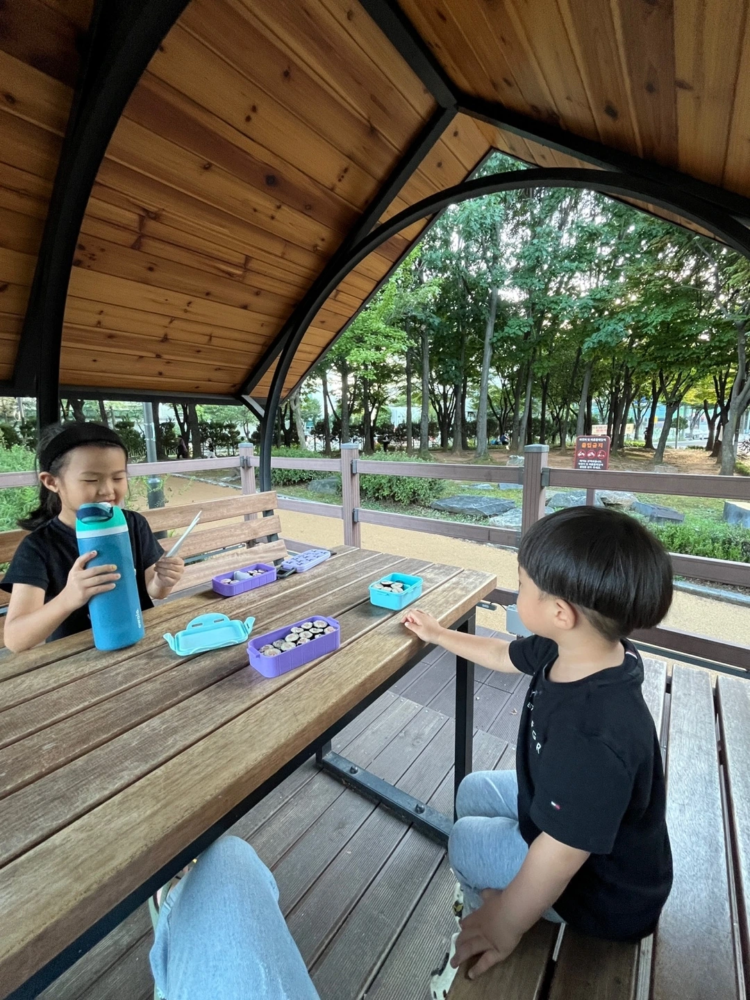 공원에 들어서자마자 폭포 앞에 벤치에서 도시락을 먹자는 첫째의 제안을 적극 수용하여 우리는 자리를 잡았다. 사실 정말 별 것 아닌 도시락인데 아이들은 연신 맛있다고 엄지 척! 했고, 둘째는 ”도시락 싸주는 엄마 최고! “ 하면서 나를 안아주기까지 했다. 하원 전에 부지런을 떤 보람이 있다고 나 자신을 칭찬하며, 신나게 뛰어다니는 아이들을 흐뭇하게 바라봤다. 밥도 먹었으니 매점을 가는 마음도 가볍다. 원하는 간식을 하나씩 골라 매점 테라스에 자리를 잡았다. 선선한 바람도, 짙어져 가는 노을도, 모두 ‘아이들과 공원에 나오기를 잘했다’고 격려해 주는 것 같았다. 그냥 공원에서 자전거와 킥보드를 타는 어쩌면 특별할 것 없는 시간이지만, 집에서 집안일로 종종거리며 아이들을 밀어내기 바쁜 저녁시간을 생각하면 이것이야 말로 아이들과의 양질의 시간을 보내는 것이라는 생각이 든다.