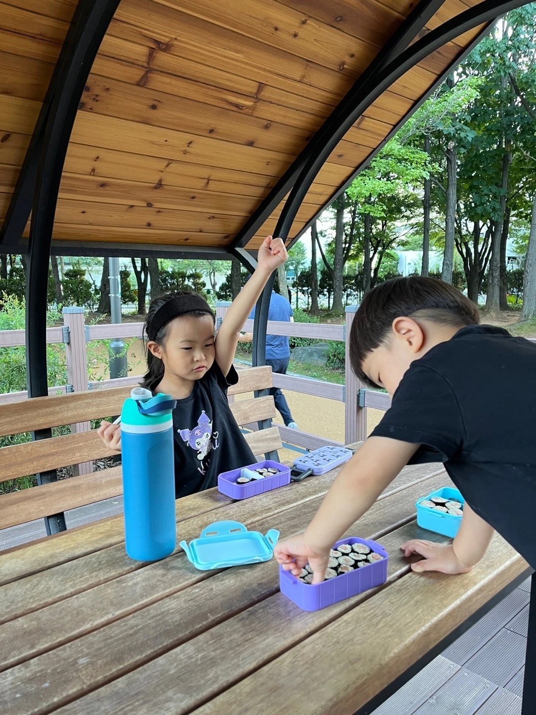 그렇게 바삐 보내다 보니 어느새 아이들 하원 시간이 다가온다. 이쯤 되면 새로운 고민이 시작된다. 저녁 메뉴는 무엇으로 할 것인지, 하원 후에는 무얼 하며 놀 것인지 등등 말이다. 5시에 하원하고 날이 좋아 바깥놀이를 할라치면 금방 저녁밥 먹을 시간이 되는데, 아이들은 놀다 보면 재미나니 절대 집에 들어갈 생각은 없고 그런데 배는 고프고, 상황이 그렇다 보니 결국 매점에서 간식을 사 먹게 되고, 그러다 보면 실컷 놀고 집에 들어가도 간식으로 배가 찬 아이들은 저녁밥을 먹는 둥 마는 둥 하게 되는 것이다. 그런데 또 나는 무슨 바람이 불었는지 (무슨 바람은 무슨 바람, 바깥놀이 하기 딱 좋은 선선한 가을바람이지) 고민 끝에 간단한 도시락을 싸기로 결정했다. 하지만 시간이 얼마 없다! 부지런히 아주아주 심플한 김밥을 싸고 큰 텀블러에 음료를 챙겼다. 이제부터 정신을 똑바로 차려야 한다!!! 등원을 전쟁이라 하는데, 하원은… (어쨌든 등원보다 훨씬 긴 시간이지 않은가. 이건 전쟁을 뛰어넘는 그 무언가다.) 어차피 놀아줘야 할 거, 제대로 놀아보자! 싶은 마음으로 하원길에 나선다. 자전거를 타고 간 둘째를 먼저 하원시킨 뒤, 킥보드를 타고 간 첫째를 데리러 갔다.