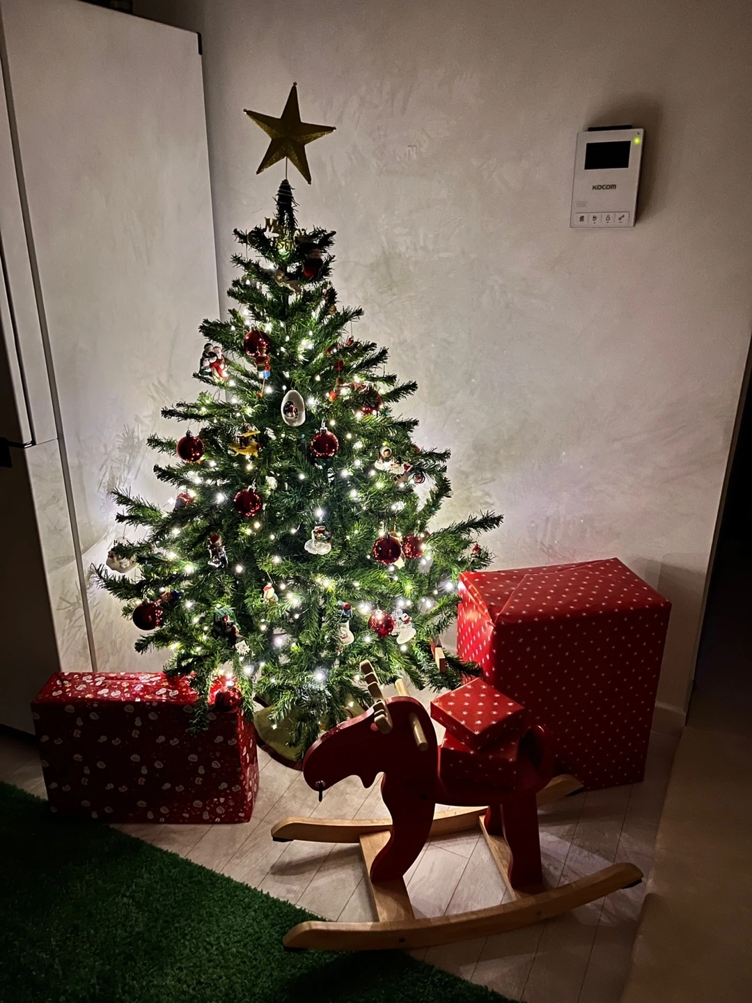 아니나 다를까, 그 이후로 아이는 태어나 처음으로 산타에 대한 의문을 품는 질문을 나에게 던졌다. 그 질문도 당황스럽기는 마찬가지였다. 아이의 질문은 이런 것이었다. 진짜 크리스마스 선물은 산타할아버지가 갖다 주는 것이냐, 엄마 아빠가 사주는 거 아니냐 뭐 이런 맥락이었다. 하… 그래… 결국 알아버렸구나 ㅠㅠㅠ 나는 다시 한번 크리스마스 선물은 산타할아버지가 주는 것임을 주장했지만… 왠지 아이의 의심은 완벽히 걷히지 않았던 것 같다. 크리스마스 아침이 밝기 전날 밤에 나는 몰래 크리스마스트리 밑에 아이들 선물을 가져다 놓았다. 그리고 첫째는 그때 그 붙박이 장안에서 보았던 그 선물을 받았다. (동생도 그때 자기가 보았던 그 선물을 받았고…) 좋아하는 캐릭터가 그려진 캐리어를 받고 싶다 해서 준비한 선물… 사이즈도 워낙 커서 다른 포장지로 다시 포장했다 해도 의심을 살만한 사이즈였다… 그 선물 말고도 비밀 선물이 하나 더 있었긴 했던 데다, 아이는 선물을 받고 무척이나 신나 했지만… 왠지 나는 가슴 한편이 씁쓸한 느낌을 지울 수가 없다…