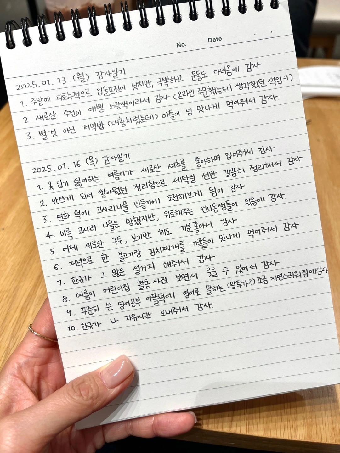 영 기운이 나지 않았다. 안 그래도 차리기 싫은 저녁밥이 더 하기가 싫어졌다. 기껏 잘 한 집안 청소와 정리까지 괜히 했다 싶었다. 그냥 가만히 누워 영화나 보며 쉴걸. 왜 하루종일 종종 거렸나 싶었다. 하지만 나는 실패로 돌아간 고사리나물을 만회하기 위해서 불고기도 하고, 김치찌개도 끓였다. 아이들도 남편도 맛나게 먹었지만 나는 내내 시무룩하게 앉아 밥을 먹었다. 그러다 문득 단체 카톡창에서 아는 언니가 “나 우울해서 지금 감사일기를 쓰려고”라고 했다. 내가 올해부터 감사일기를 같이 쓰자고 제안했던 단체 카톡창에 있는 언니였다. 원래 감사일기를 함께 공유하는 다른 단체 카톡창에서도 연달아 감사일기들이 올라왔다. 그중 한 동생은 얼마 전 송혜교가 유퀴즈에 나와 5년 동안 저녁마다 그날 하루 감사 했던 일들을 10가지씩 적었다고 한 말을 들었다며 자기도 10개를 써보려다 7개를 찾았다며 감사일기를 올렸다. 그 단체 카톡창들을 보면서 나도 울적하지만, 감사일기를 써야겠다고 생각했다. (생각해보니 감사일기 쓰는 걸 이틀이나 빼먹고 있었더라.) 그리고 이번엔 나도 10개를 한 번 써봐야겠다며 연필을 들었다. (평소에는 3가지 정도를 적고는 했다.)