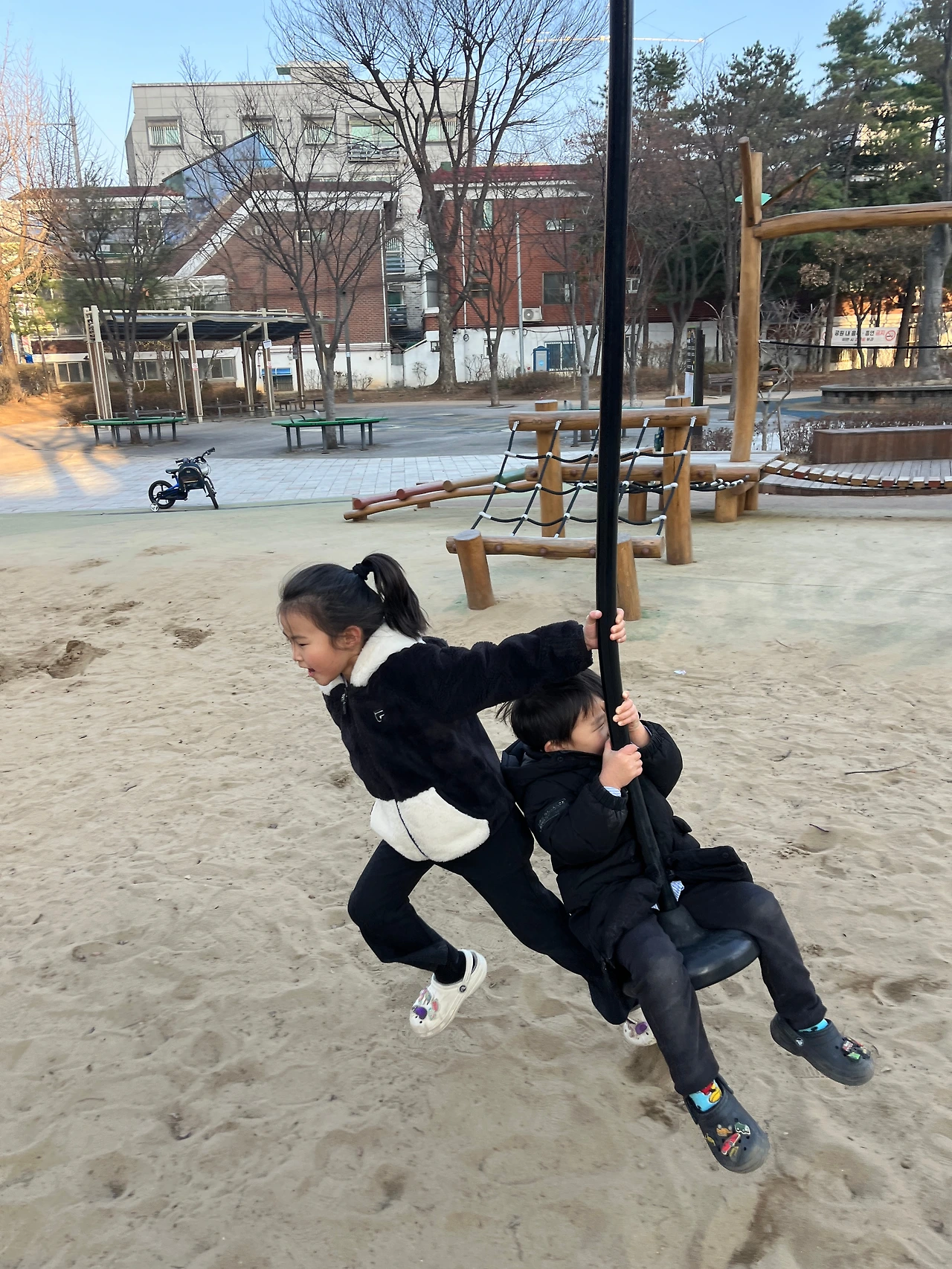 한참을 놀이터에서 이것저것 하고 놀다가 내가 이제 해가 지면서 추워지니 그만 집에 가자고 했다. 아이들은 아쉬워했다. 나는 아쉬워하는 아이들에게 짚라인을 한 번씩 더 타고 가자고 했더니 아이들은 신이 나서 짚라인으로 달려갔다. 그런데 의외로 둘째가 날더러 짚라인을 두 번 타고 가면 안 되겠냐고 하는 게 아닌가. 또 금방 아이는 말을 바꿨다. “아니, 5번!” 나는 무서워서 혼자 타지도 못하면서 5번 더 타겠다고 하는 둘째가 의아했지만 그러라고 했다. 괜히 집에 가기 싫으니까 타지도 않을 짚라인을 많이 타겠다고 우기는 거라 생각했다. 그러고는 나는 바로 앞 다른 놀이기구에 걸터앉아 아이들을 기다렸다.