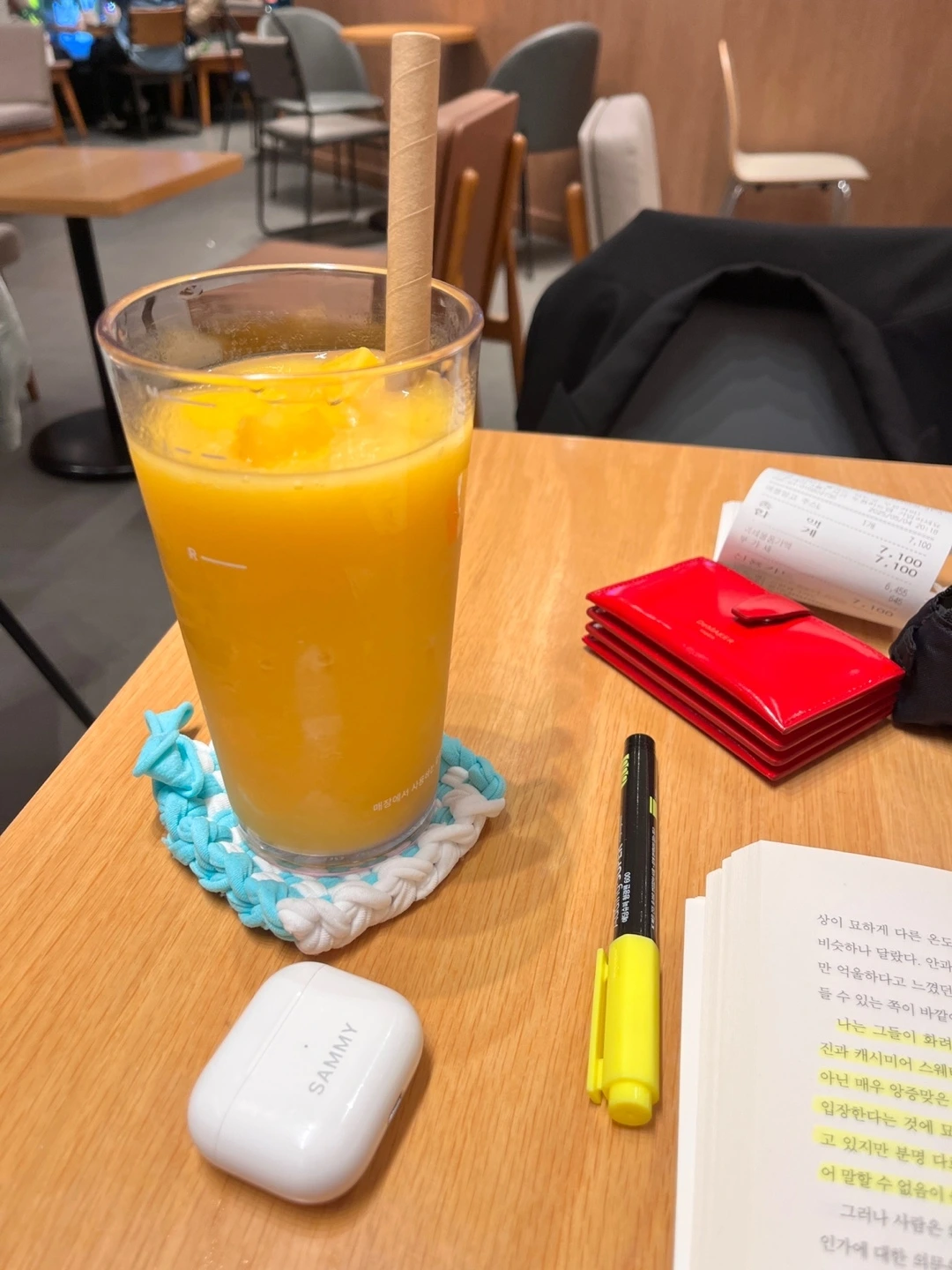 저녁 식사 후 자유시간을 가지러 나갈 준비를 하는 나에게 가을이(첫째 만 6세)가 말했다. “엄마 혹시 카페에서 책 읽고 글 쓰고 할 거면 (어떻게 알았지?ㅋㅋ) 그거 가져가요.” 학교 방과 후 수업인 ’ 핸드아트‘ 시간에 만든 티코스터를 말하는 것이다. 가을이는 그것을 나에게 선물했다. 나는 카페에 왔고, 애플망고주스 아래 하얗고 푸른색이 섞인 그 티코스터를 깔았다. 그리고 나는 충분히 사랑받고 있다고 느꼈다.